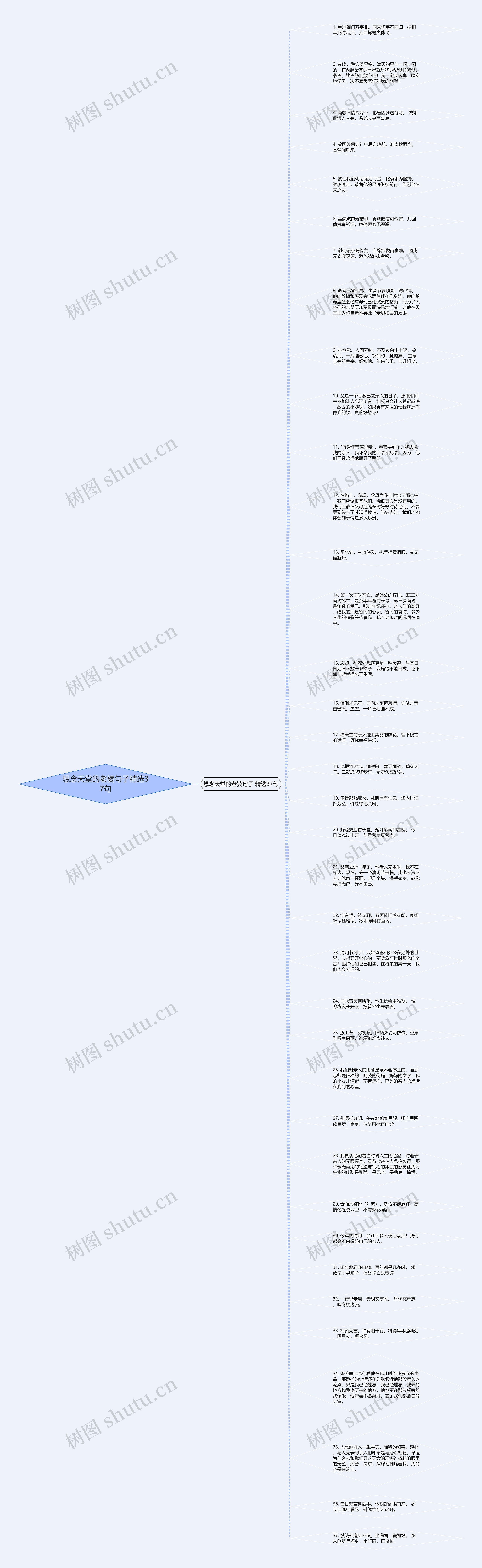 34. 茶碗里还温存着他在我儿时给我浸泡的生命,那透彻的心情还在为我倾诉他那段年久的沧桑,只是我已经遗忘,我已经遗忘,我来的地方和我将要去的地方,他也不在那书桌旁陪我倾谈,他带着不愿离开,去了我们都会去的天堂。