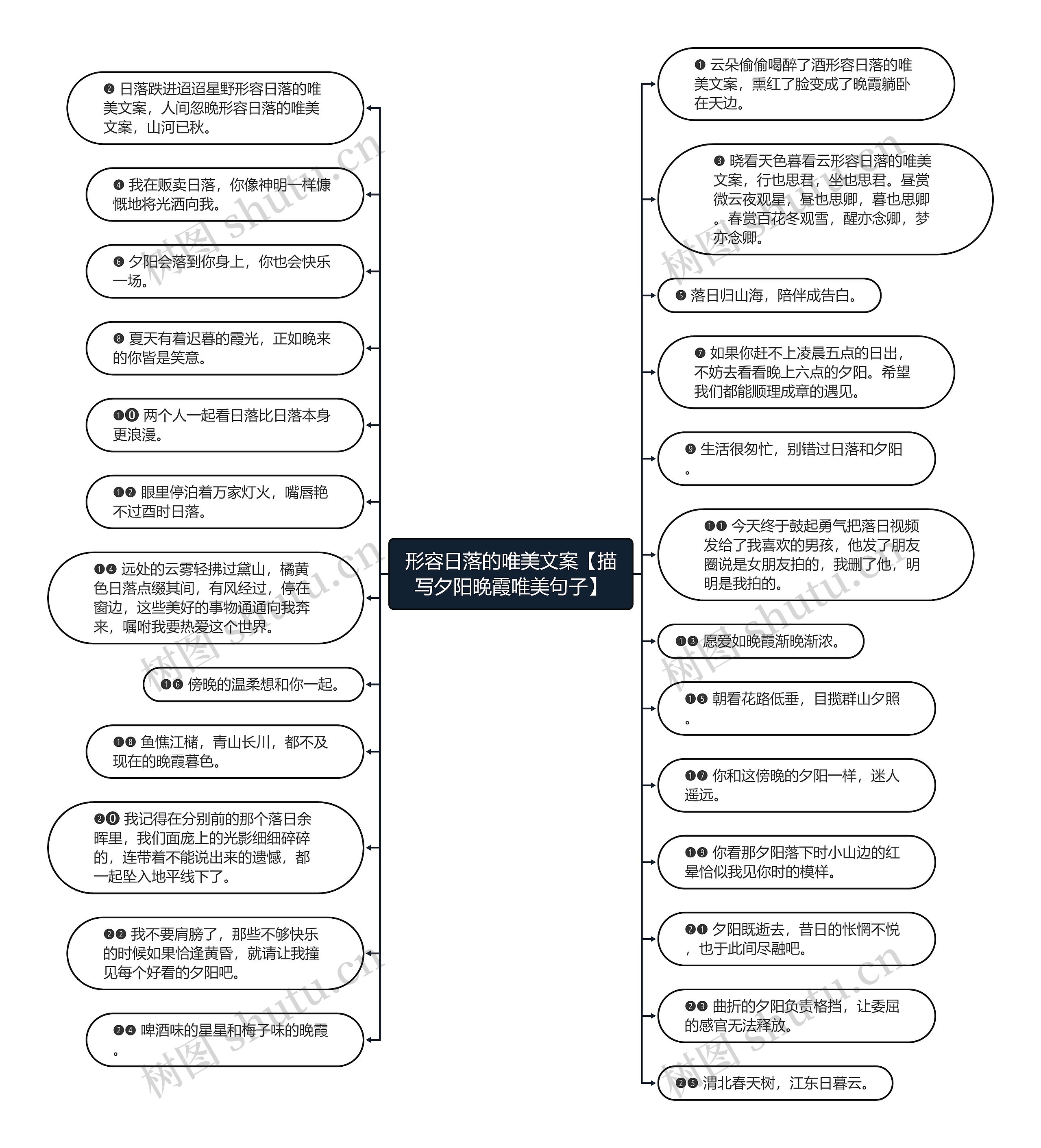 树图思维导图提供《形容日落的唯美文案【描写夕阳晚霞唯美句子】》在线思维导图免费制作,点击“编辑”按钮,可对《形容日落的唯美文案【描写夕阳晚霞唯美句子】》进行在线思维导图编辑,本思维导图属于思维导图模板主题,文件编号是:1f6fe0cebea026cbfbe7e3efa08c8f93
