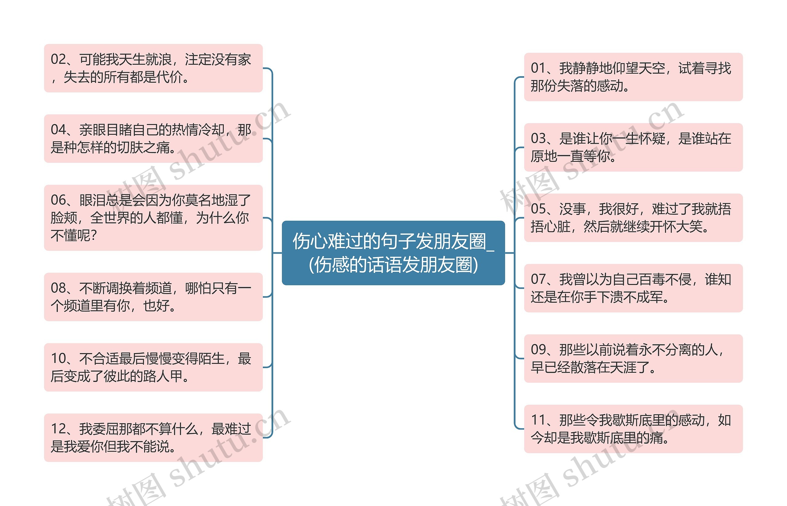 树图思维导图提供《伤心难过的句子发朋友圈_(伤感的话语发朋友圈)》在线思维导图免费制作,点击“编辑”按钮,可对《伤心难过的句子发朋友圈_(伤感的话语发朋友圈)》进行在线思维导图编辑,本思维导图属于思维导图模板主题,文件编号是:9bfa9801507a43c170d59eef4bed4179