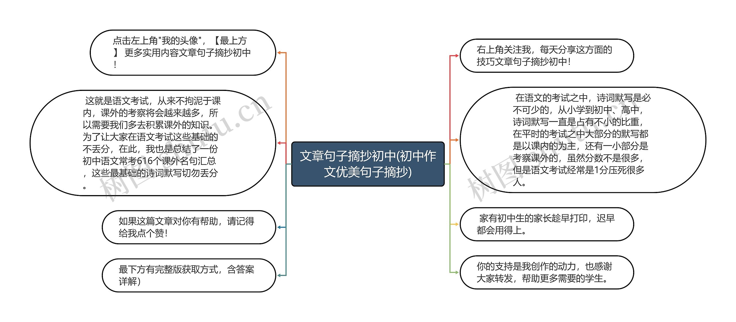 树图思维导图提供《文章句子摘抄初中(初中作文优美句子摘抄)》在线思维导图免费制作,点击“编辑”按钮,可对《文章句子摘抄初中(初中作文优美句子摘抄)》进行在线思维导图编辑,本思维导图属于思维导图模板主题,文件编号是:18e076d3e0369e801032d40076b0fa09