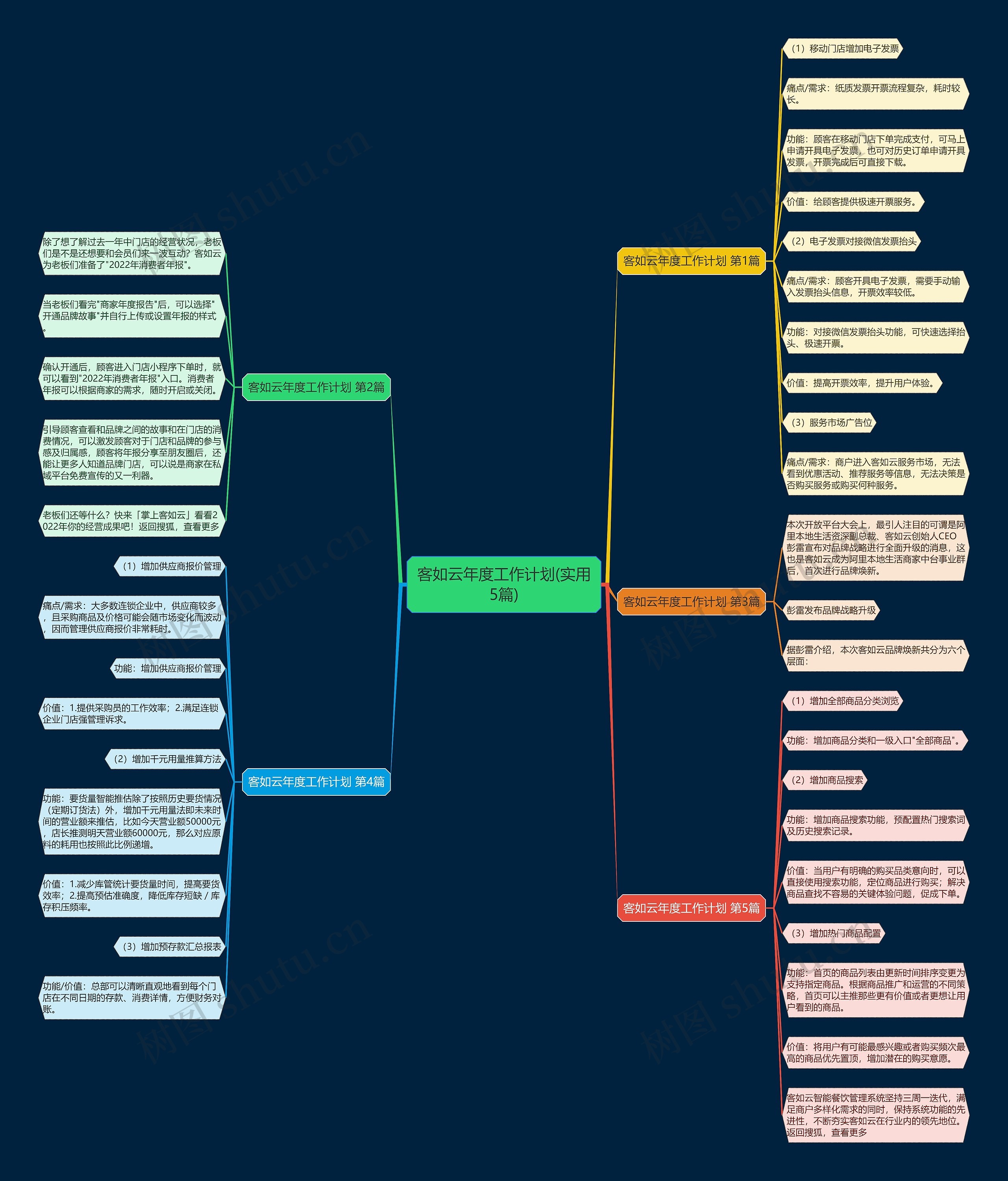 树图思维导图提供《客如云年度工作计划(实用5篇)》在线思维导图免费制作,点击“编辑”按钮,可对《客如云年度工作计划(实用5篇)》进行在线思维导图编辑,本思维导图属于思维导图模板主题,文件编号是:c29f4d160bd545b34bf8f7cc6ef9f3f9