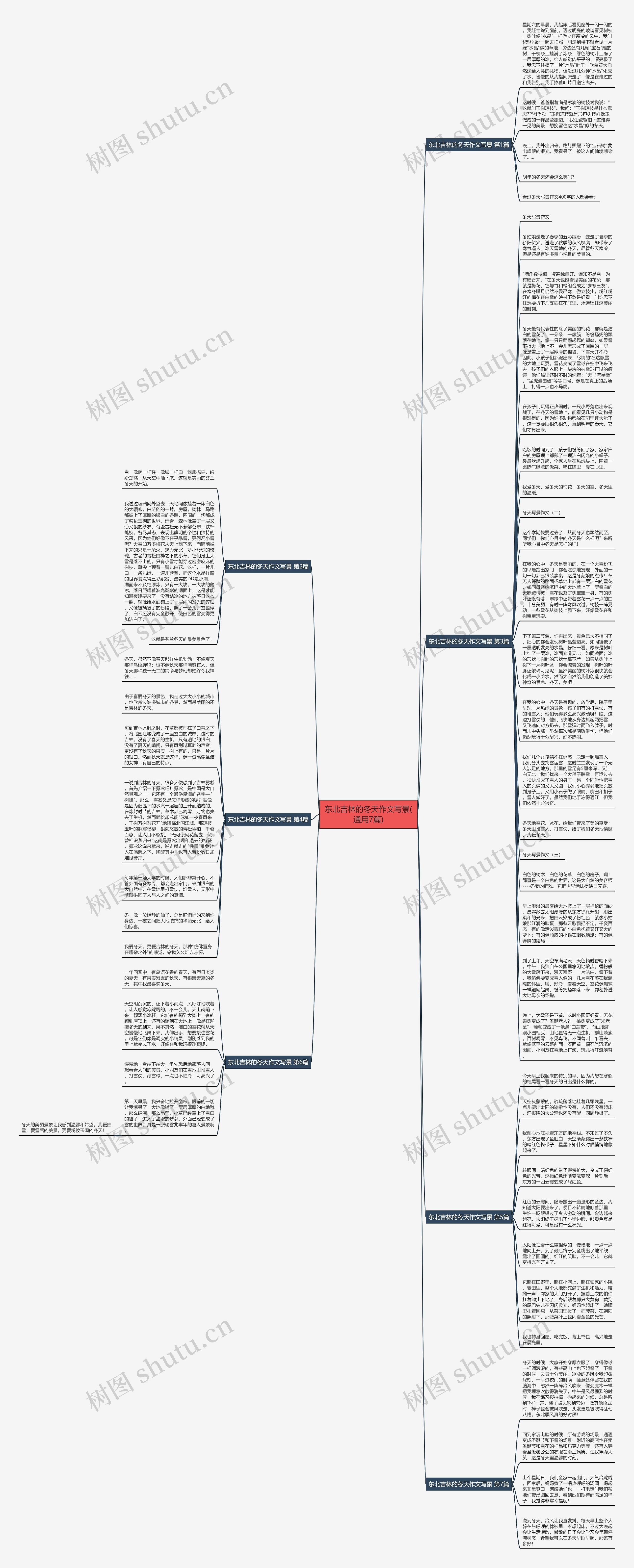 晚上,大雪还是下着。这时小园更好看!无花果树变成了?圣诞老人?,桃树变成了"米老鼠",葡萄变成了一条条"白莲带"。而山地却跟小园相反,山地显得无一点生机:群山萧索,百树凋零,不见鸟飞,不闻兽叫,乍看去,就像低垂的云幕前面,凝固着一幅死气沉沉的图画。小朋友在雪地上打滚,玩儿得汗流浃背。