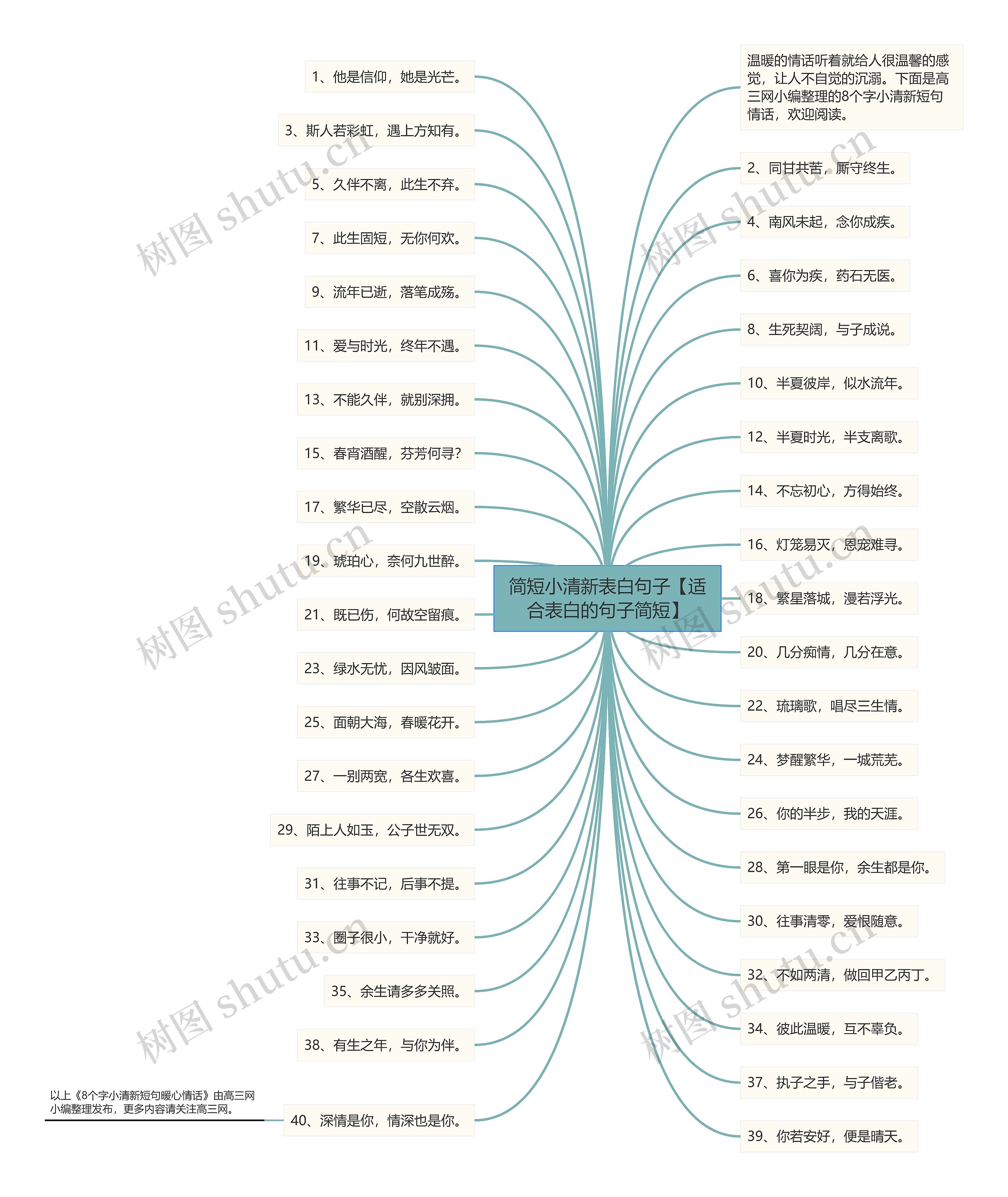 树图思维导图提供《简短小清新表白句子【适合表白的句子简短】》在线思维导图免费制作,点击“编辑”按钮,可对《简短小清新表白句子【适合表白的句子简短】》进行在线思维导图编辑,本思维导图属于思维导图模板主题,文件编号是:645a76137c15d825d7e6e448ee96d484
