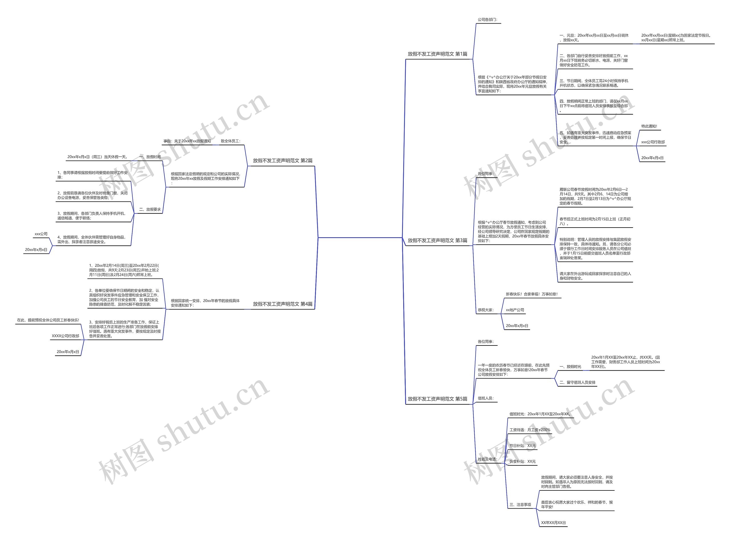 树图思维导图提供《放假不发工资声明范文(精选5篇)》在线思维导图免费制作,点击“编辑”按钮,可对《放假不发工资声明范文(精选5篇)》进行在线思维导图编辑,本思维导图属于思维导图模板主题,文件编号是:47589a6930e22e8e047143588cf09197