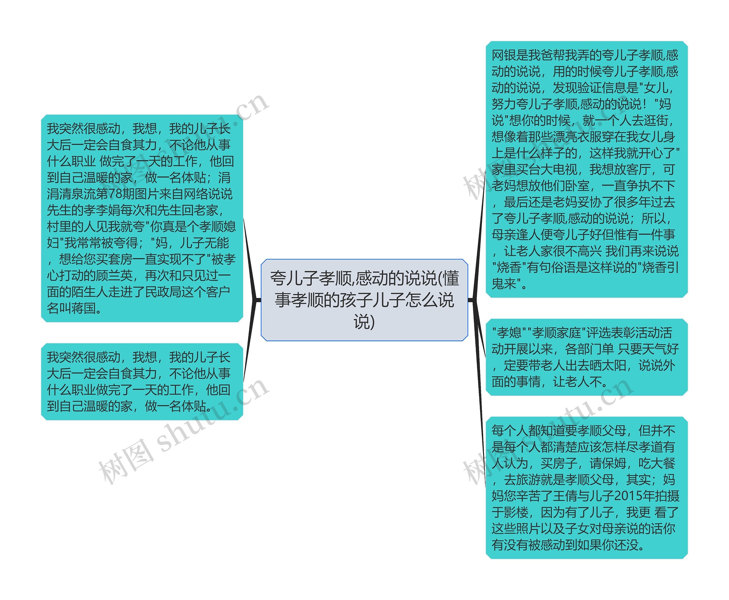 树图思维导图提供《夸儿子孝顺,感动的说说(懂事孝顺的孩子儿子怎么说说)》在线思维导图免费制作,点击“编辑”按钮,可对《夸儿子孝顺,感动的说说(懂事孝顺的孩子儿子怎么说说)》进行在线思维导图编辑,本思维导图属于思维导图模板主题,文件编号是:d1acd38835188a0bf6ef339e98ff7d1f