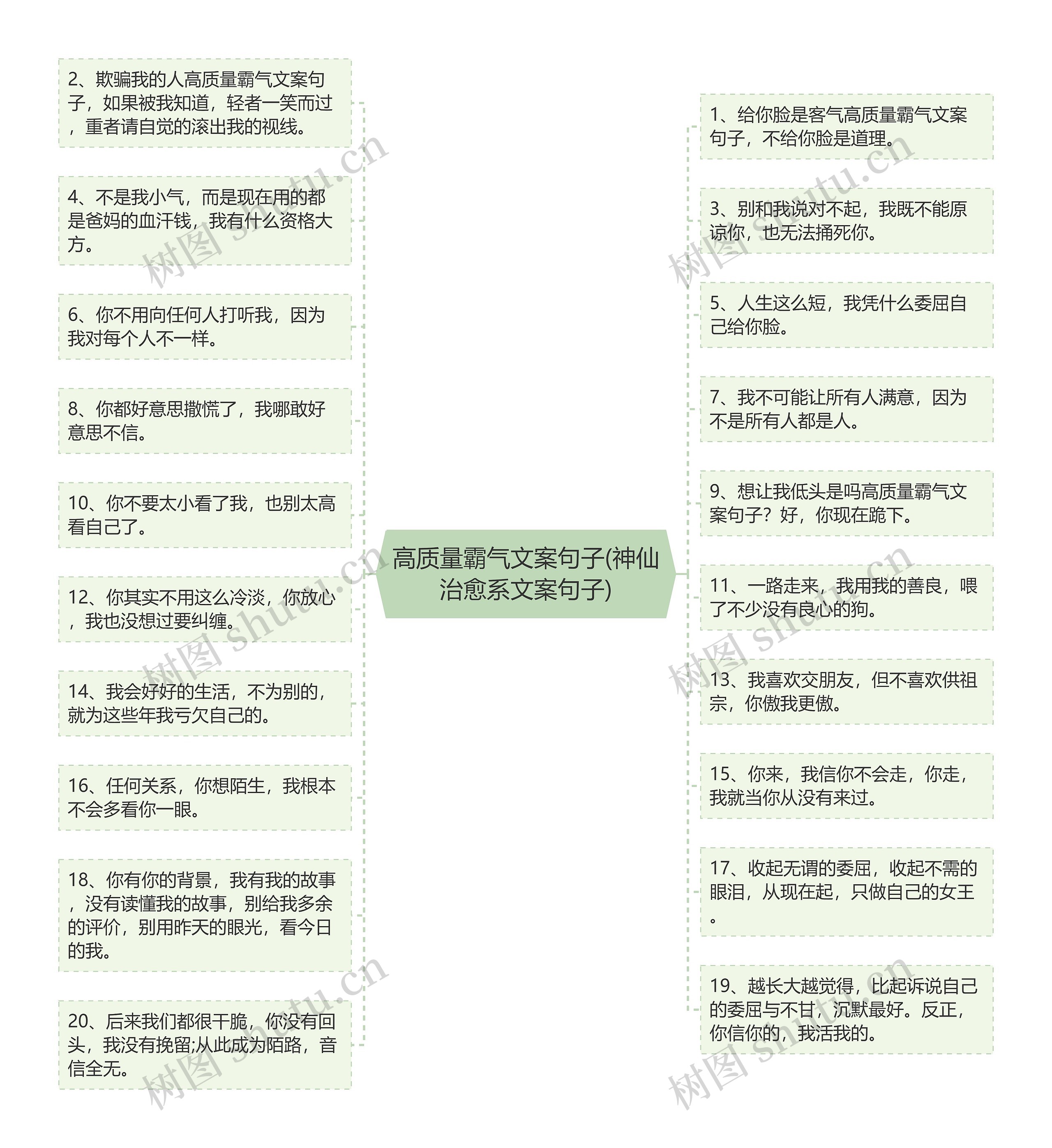 树图思维导图提供《高质量霸气文案句子(神仙治愈系文案句子)》在线思维导图免费制作,点击“编辑”按钮,可对《高质量霸气文案句子(神仙治愈系文案句子)》进行在线思维导图编辑,本思维导图属于思维导图模板主题,文件编号是:6971cc6dc673a7c5016736107be9a49e