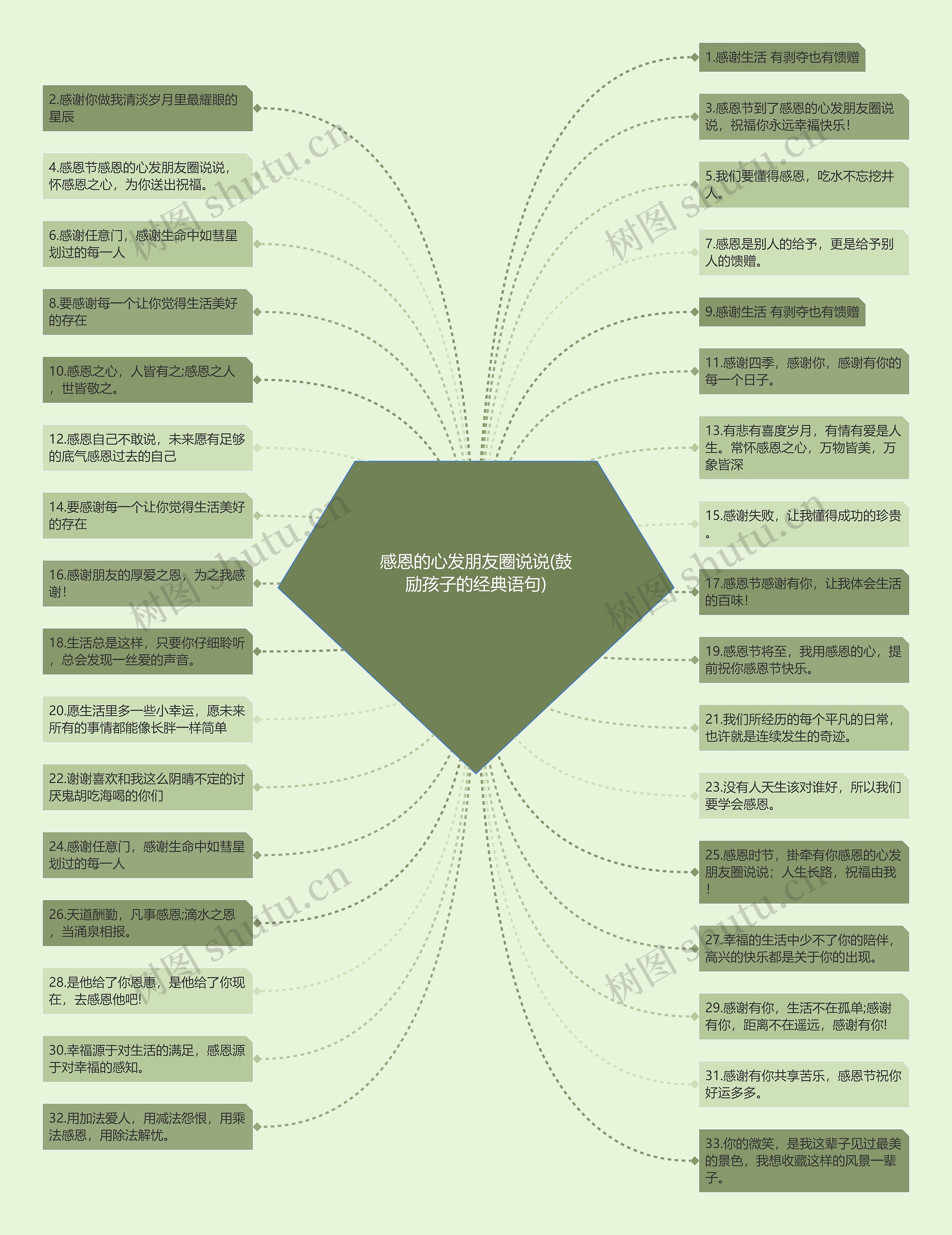 树图思维导图提供《感恩的心发朋友圈说说(鼓励孩子的经典语句)》在线思维导图免费制作,点击“编辑”按钮,可对《感恩的心发朋友圈说说(鼓励孩子的经典语句)》进行在线思维导图编辑,本思维导图属于思维导图模板主题,文件编号是:c7d26f1955db02bbb3d62ab84e15c9e6