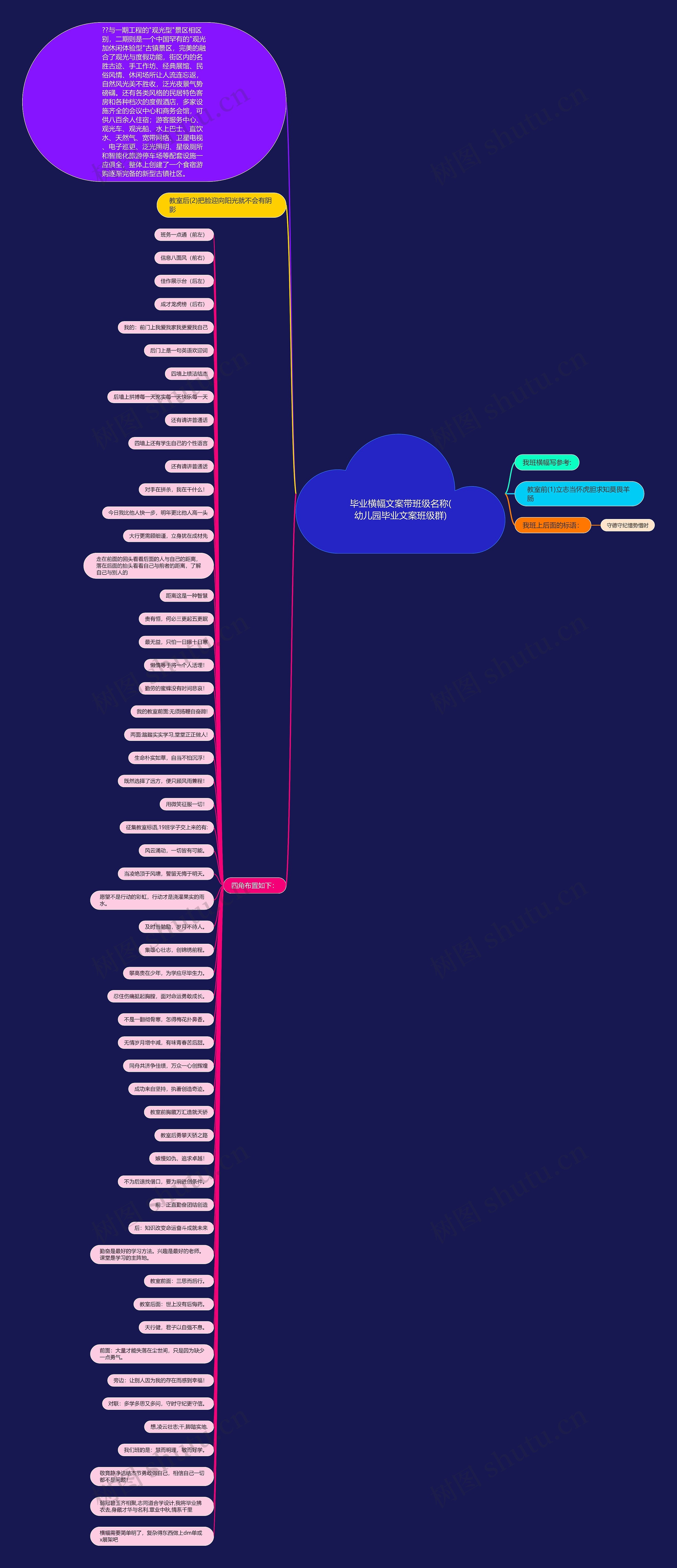 树图思维导图提供《毕业横幅文案带班级名称(幼儿园毕业文案班级群)》在线思维导图免费制作,点击“编辑”按钮,可对《毕业横幅文案带班级名称(幼儿园毕业文案班级群)》进行在线思维导图编辑,本思维导图属于思维导图模板主题,文件编号是:ecb267745d049c3f3cbd06db34977e81