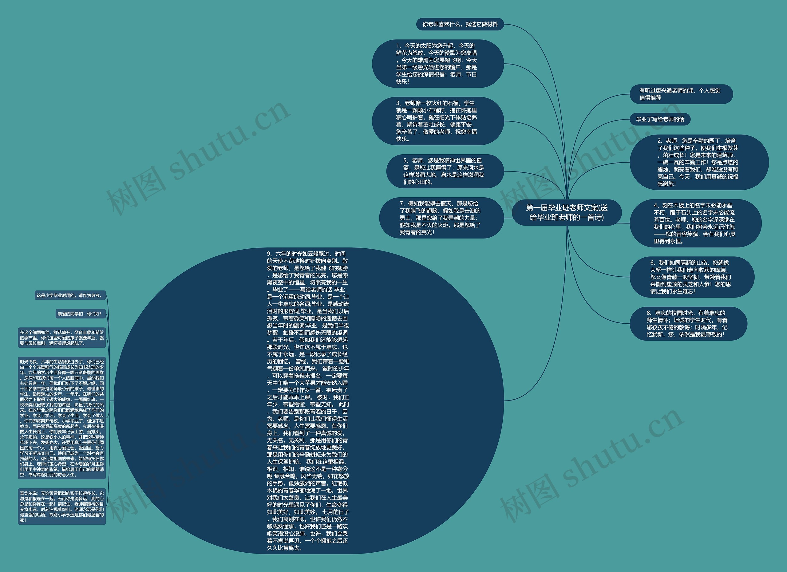 9、六年的时光如云般飘过,时间的天使不苟地将时针拨向离别。敬爱的老师,是您给了我健飞的翅膀,是您给了我青春的光亮,您是漆黑夜空中的恒星,将照亮我的一生。毕业了——写给老师的话 毕业,是一个沉重的动词;毕业,是一个让人一生难忘的名词;毕业,是感动流泪时的形容词;毕业,是当我们以后孤寂,带着微笑和隐隐的遗憾去回想当年时的副词;毕业,是我们半夜梦醒,触碰不到而感伤无限的虚词。若干年后,假如我们还能够想起那段时光,也许这不属于难忘,也不属于永远,是一段记录了成长经历的回忆。 曾经,我们带着一脸稚气撷着一份单纯而来。 彼时的少年,可以穿着拖鞋来报名,一定要每天中午啃一个大苹果才能安然入睡,一定要为非作歹一番,被斥责了之后才能乖乖上课。 彼时,我们正年少,带些懵懂,带些无知。 此时,我们要告别那段青涩的日子,因为,老师,是你们让我们懂得生活需要感念,人生需要感恩。在你们身上,我们看到了一种真诚的爱,无关名,无关利,那是用你们的青春来让我们的青春绽放地更美好,那是用你们的辛勤耕耘来为我们的人生保驾护航。 我们在这里相遇,相识,相知,谁说这不是一种缘分呢 琴瑟合鸣,风华无端,如花怒放的手势,孤独激烈的声音,红艳似木棉的青春华丽地泻了一地。世界对我们太善良,让我们在人生最美好的时光里遇见了你们,生命变得如此美好,如此美妙。 七月的日子,我们离别在即。也许我们仍然不够成熟懂事,也许我们还是一路欢歌笑语没心没肺,也许,我们会哭着不肯说再见,一个个拥抱之后还久久比肯离去。