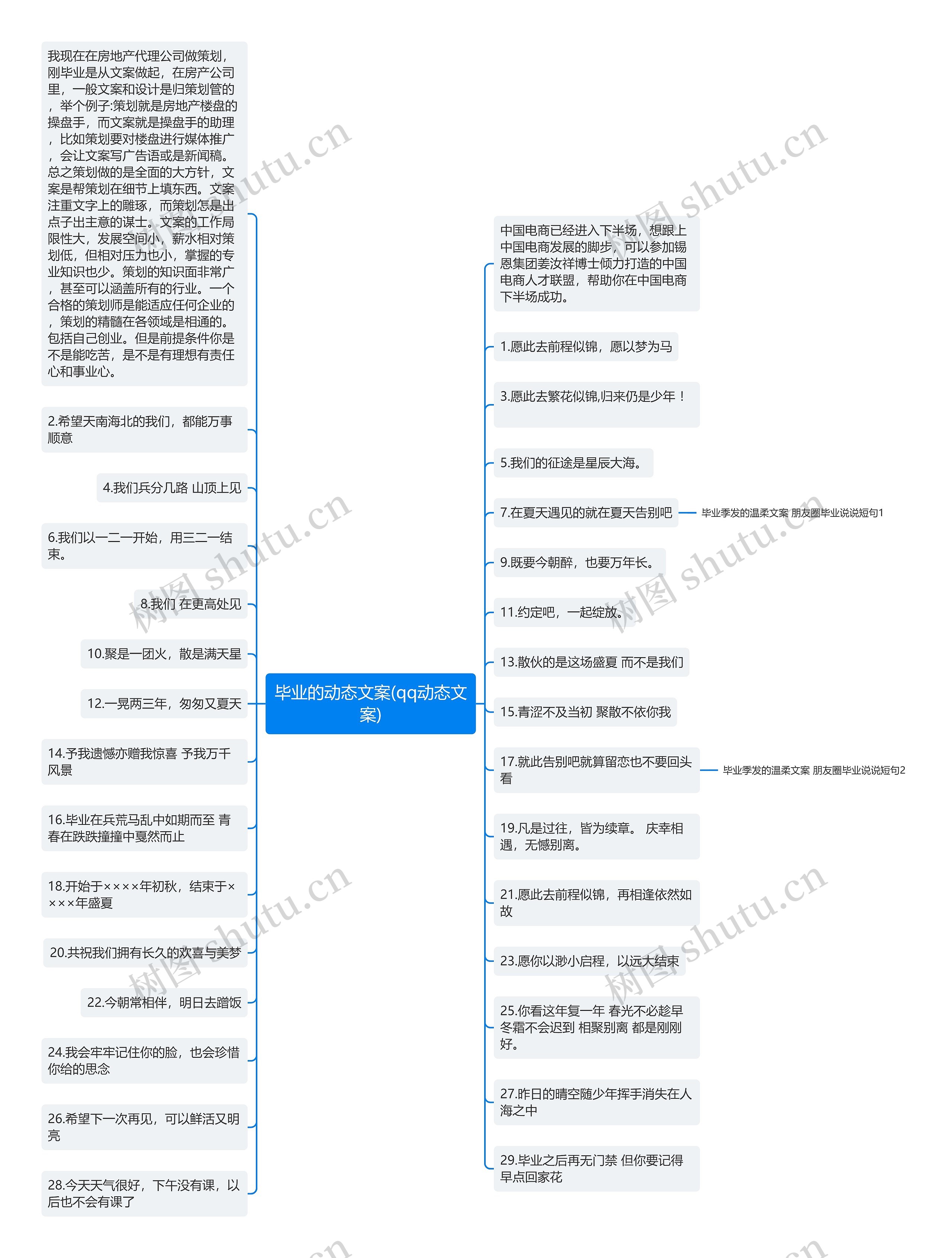 树图思维导图提供《毕业的动态文案(qq动态文案)》在线思维导图免费制作,点击“编辑”按钮,可对《毕业的动态文案(qq动态文案)》进行在线思维导图编辑,本思维导图属于思维导图模板主题,文件编号是:23899916998f2a1589ac7becc5509fa9