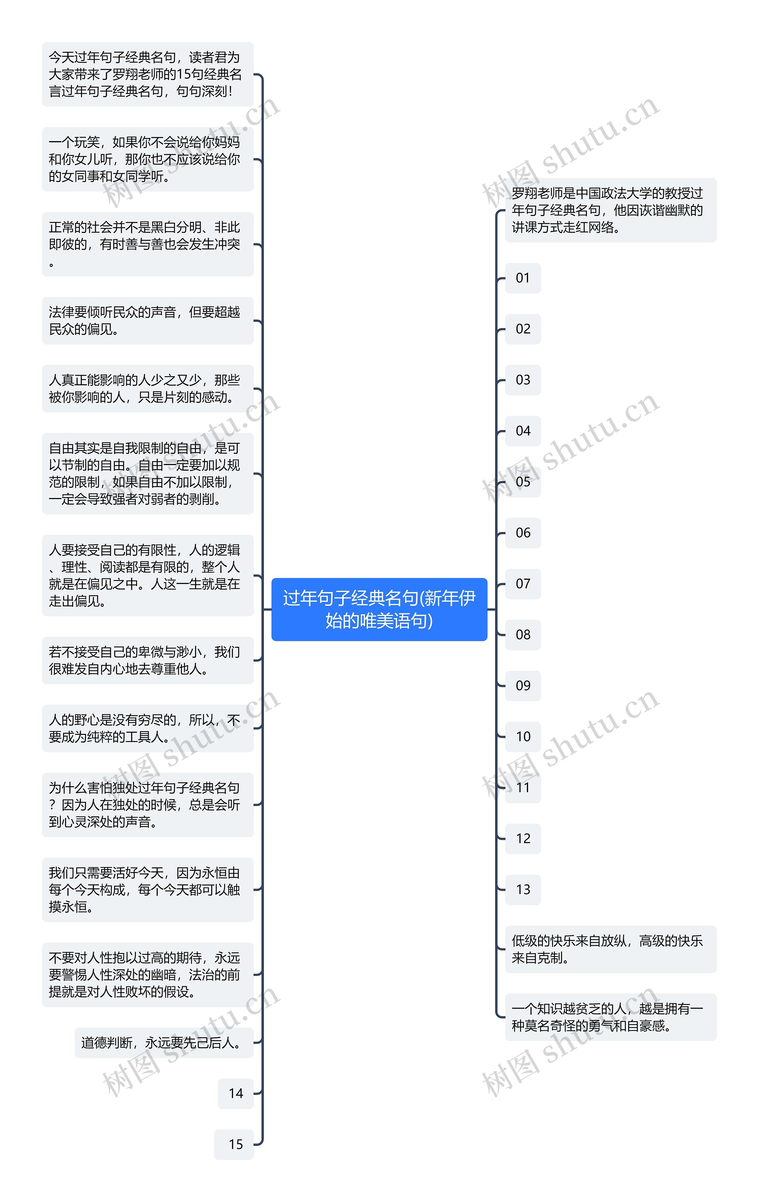 树图思维导图提供《过年句子经典名句(新年伊始的唯美语句)》在线思维导图免费制作,点击“编辑”按钮,可对《过年句子经典名句(新年伊始的唯美语句)》进行在线思维导图编辑,本思维导图属于思维导图模板主题,文件编号是:c6ffe8cd3753bc3225849a292383a13d