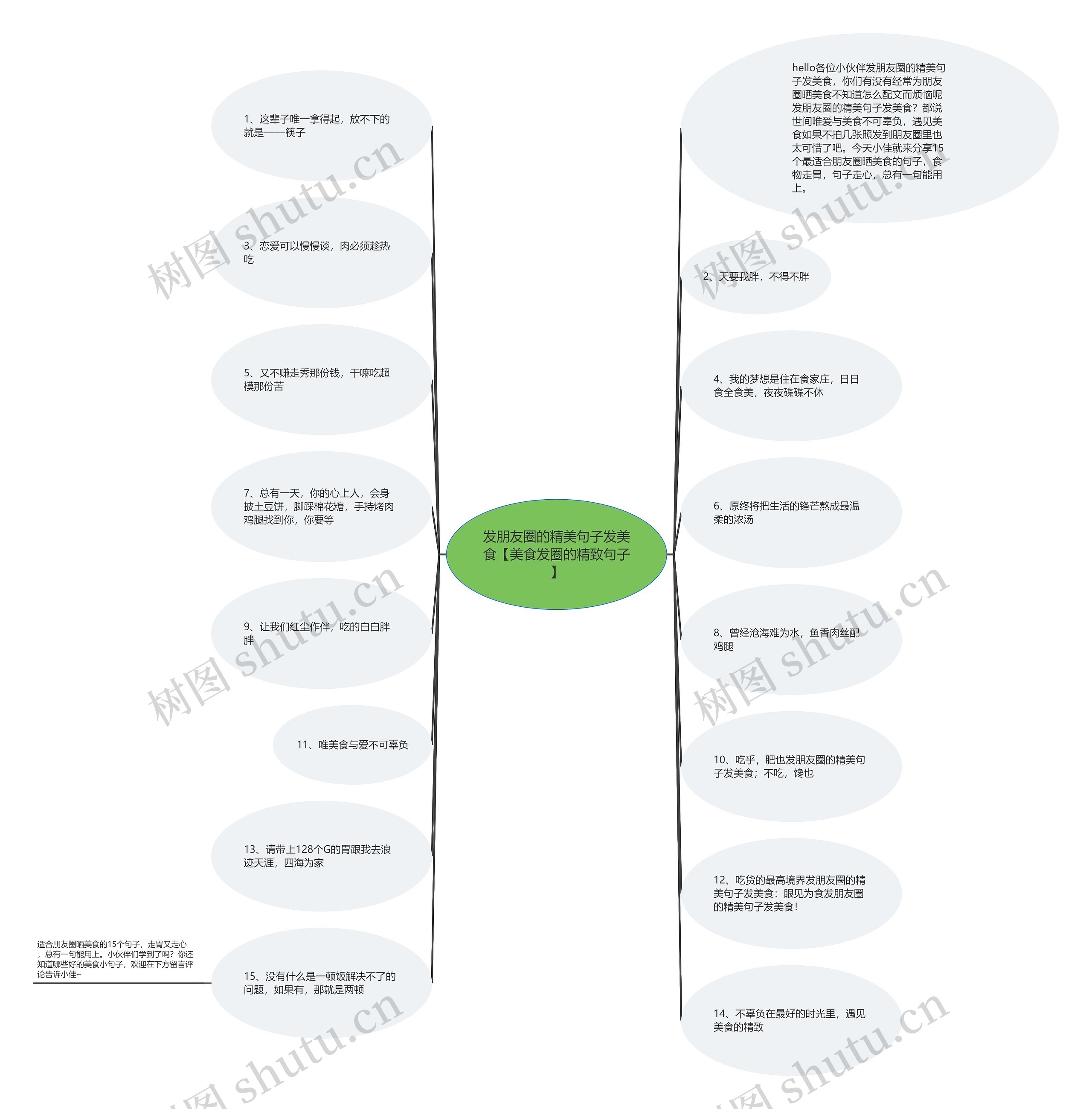 树图思维导图提供《发朋友圈的精美句子发美食【美食发圈的精致句子】》在线思维导图免费制作,点击“编辑”按钮,可对《发朋友圈的精美句子发美食【美食发圈的精致句子】》进行在线思维导图编辑,本思维导图属于思维导图模板主题,文件编号是:89a3a94e74a44d7e3a1a5e2cb8de8738