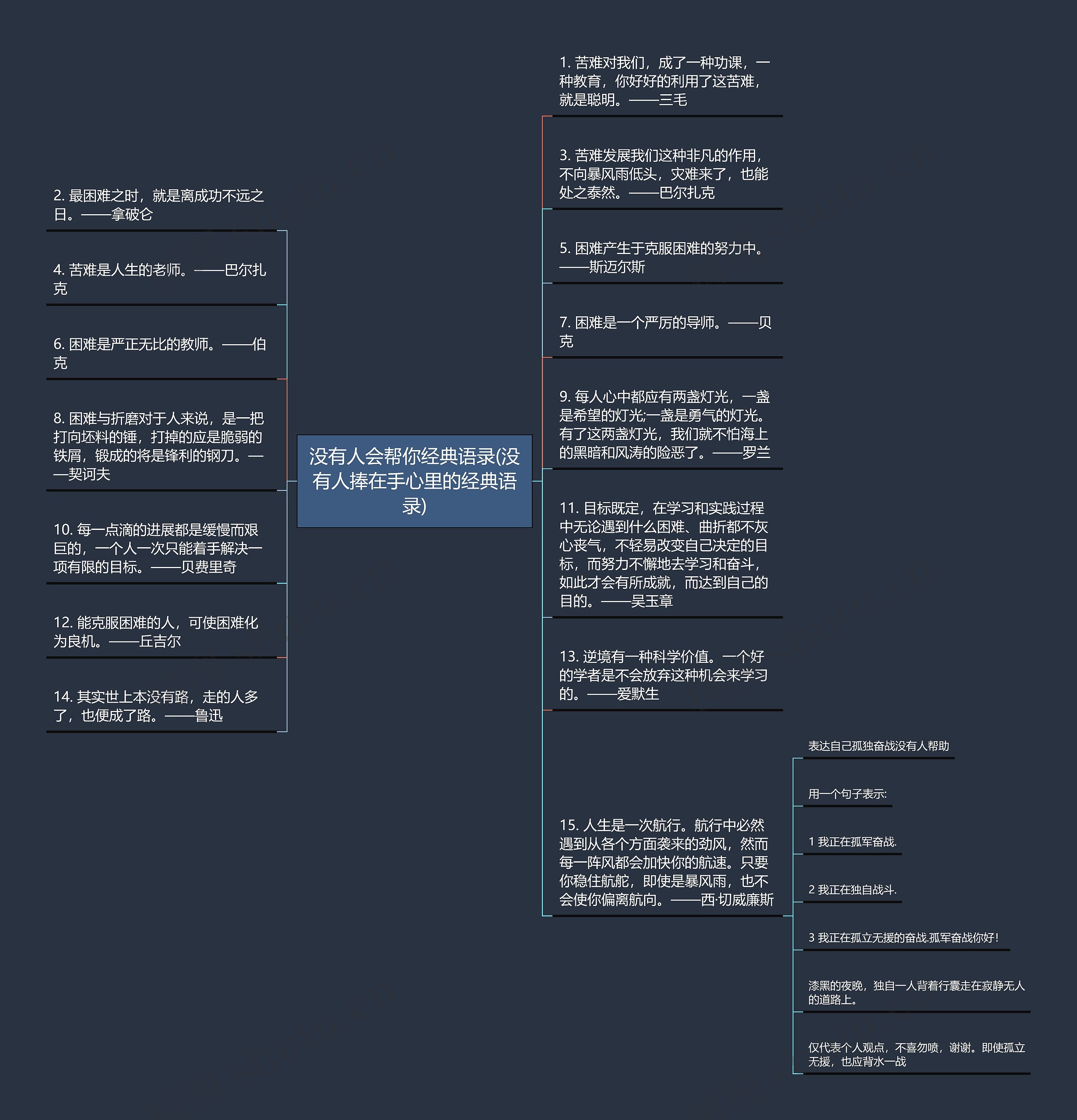 树图思维导图提供《没有人会帮你经典语录(没有人捧在手心里的经典语录)》在线思维导图免费制作,点击“编辑”按钮,可对《没有人会帮你经典语录(没有人捧在手心里的经典语录)》进行在线思维导图编辑,本思维导图属于思维导图模板主题,文件编号是:a5d2b15f54288769de4fbe7ca3de211f