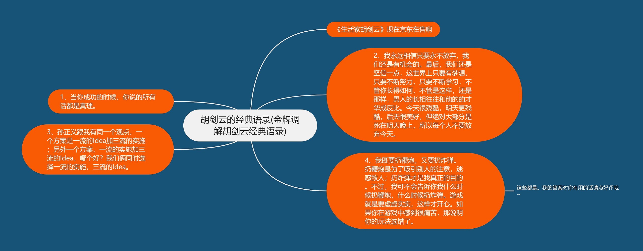 树图思维导图提供《胡剑云的经典语录(金牌调解胡剑云经典语录)》在线思维导图免费制作,点击“编辑”按钮,可对《胡剑云的经典语录(金牌调解胡剑云经典语录)》进行在线思维导图编辑,本思维导图属于思维导图模板主题,文件编号是:fadb489cb4f3a180f3baaebaef6e54b6