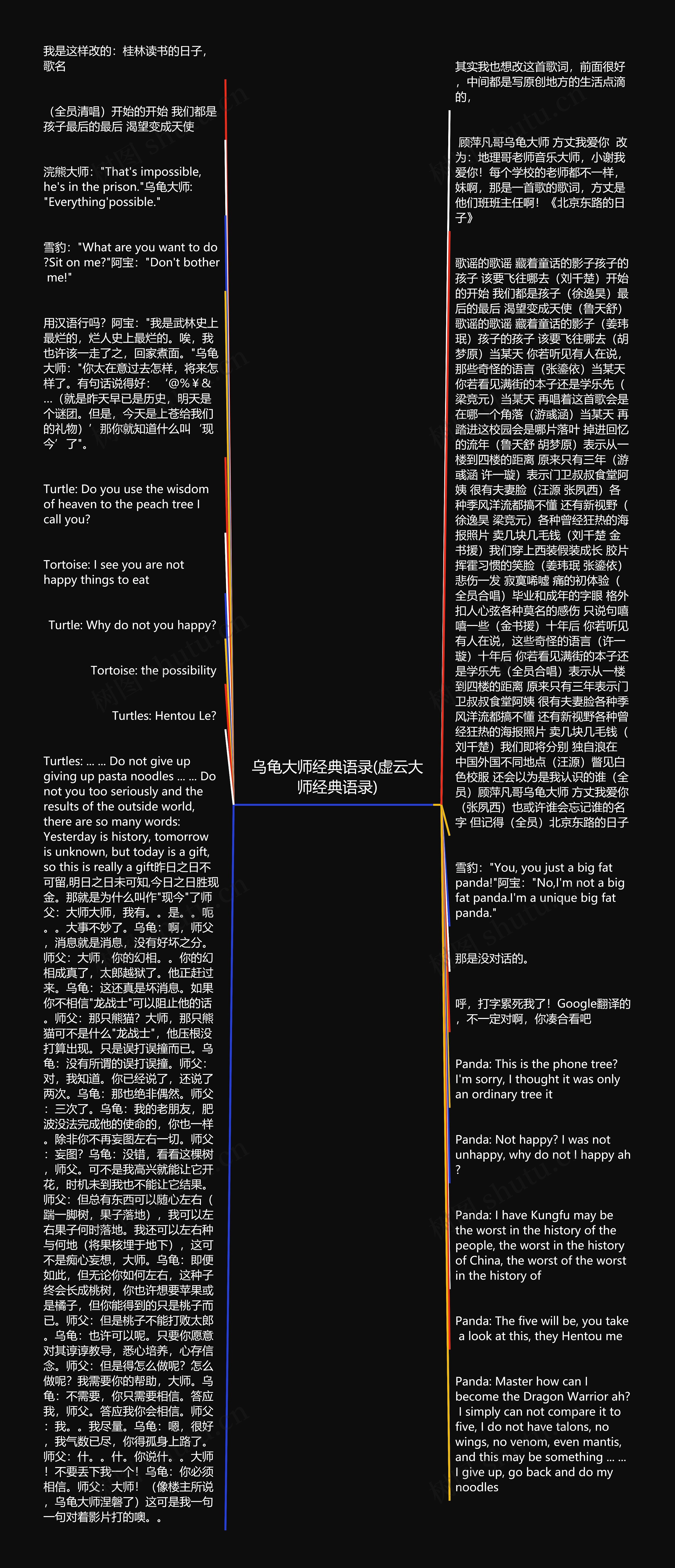 Turtles: ... ... Do not give up giving up pasta noodles ... ... Do not you too seriously and the results of the outside world, there are so many words: Yesterday is history, tomorrow is unknown, but today is a gift, so this is really a gift昨日之日不可留,明日之日未可知,今日之日胜现金。那就是为什么叫作"现今"了师父:大师大师,我有。。是。。呃。。大事不妙了。乌龟:啊,师父,消息就是消息,没有好坏之分。师父:大师,你的幻相。。你的幻相成真了,太郎越狱了。他正赶过来。乌龟:这还真是坏消息。如果你不相信"龙战士"可以阻止他的话。师父:那只熊猫?大师,那只熊猫可不是什么"龙战士",他压根没打算出现。只是误打误撞而已。乌龟:没有所谓的误打误撞。师父:对,我知道。你已经说了,还说了两次。乌龟:那也绝非偶然。师父:三次了。乌龟:我的老朋友,肥波没法完成他的使命的,你也一样。除非你不再妄图左右一切。师父:妄图?乌龟:没错,看看这棵树,师父。可不是我高兴就能让它开花,时机未到我也不能让它结果。师父:但总有东西可以随心左右(踹一脚树,果子落地),我可以左右果子何时落地。我还可以左右种与何地(将果核埋于地下),这可不是痴心妄想,大师。乌龟:即便如此,但无论你如何左右,这种子终会长成桃树,你也许想要苹果或是橘子,但你能得到的只是桃子而已。师父:但是桃子不能打败太郎。乌龟:也许可以呢。只要你愿意对其谆谆教导,悉心培养,心存信念。师父:但是得怎么做呢?怎么做呢?我需要你的帮助,大师。乌龟:不需要,你只需要相信。答应我,师父。答应我你会相信。师父:我。。我尽量。乌龟:嗯,很好,我气数已尽,你得孤身上路了。师父:什。。什。你说什。。大师!不要丢下我一个!乌龟:你必须相信。师父:大师!(像楼主所说,乌龟大师涅磐了)这可是我一句一句对着影片打的噢。。