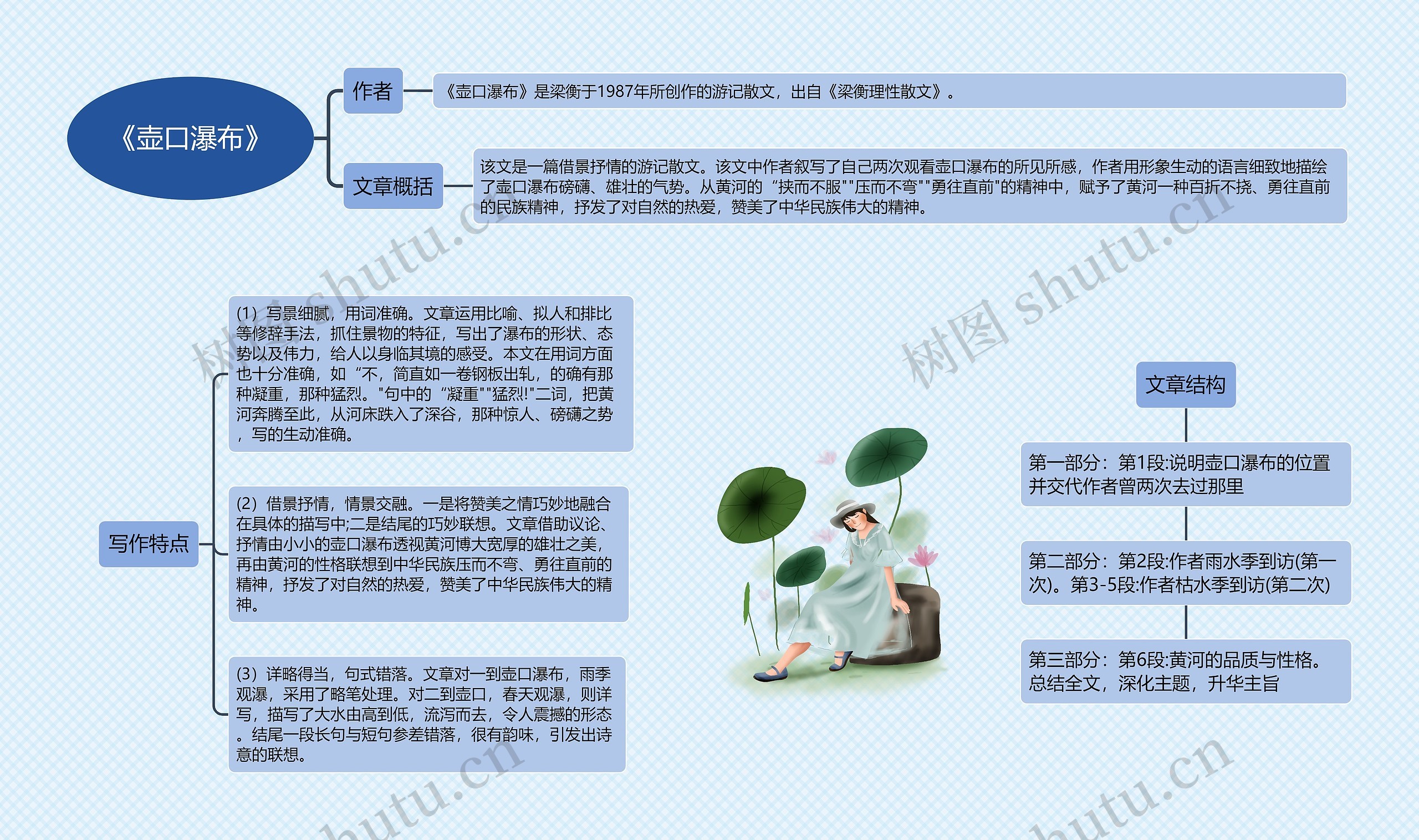 (2)借景抒情,情景交融。一是将赞美之情巧妙地融合在具体的描写中;二是结尾的巧妙联想。文章借助议论、抒情由小小的壶口瀑布透视黄河博大宽厚的雄壮之美,再由黄河的性格联想到中华民族压而不弯、勇往直前的精神,抒发了对自然的热爱,赞美了中华民族伟大的精神。