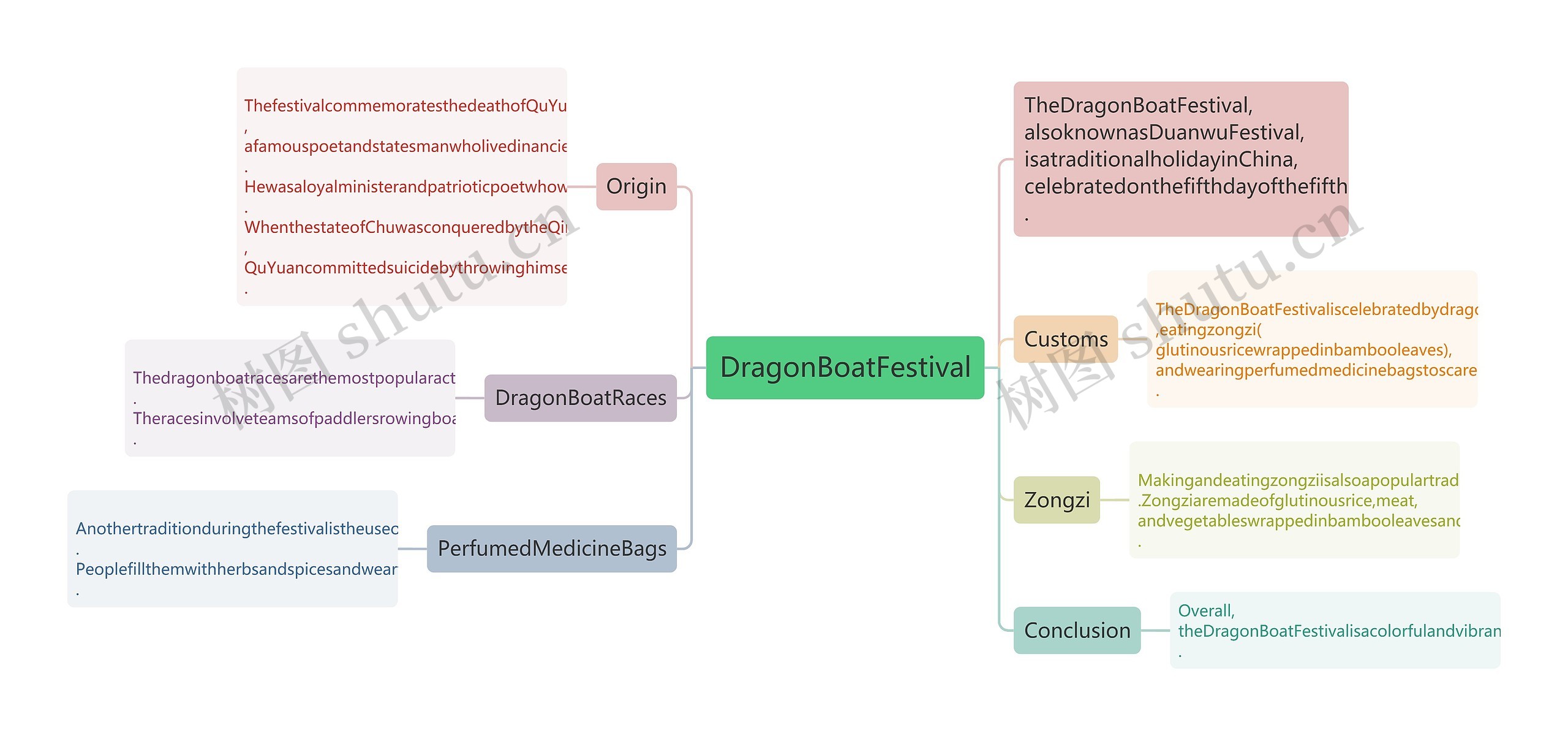 树图思维导图提供《DragonBoatFestival》在线思维导图免费制作,点击“编辑”按钮,可对《DragonBoatFestival》进行在线思维导图编辑,本思维导图属于思维导图模板主题,文件编号是:75cf860fac14c8d6d47bbd6a6db2925e