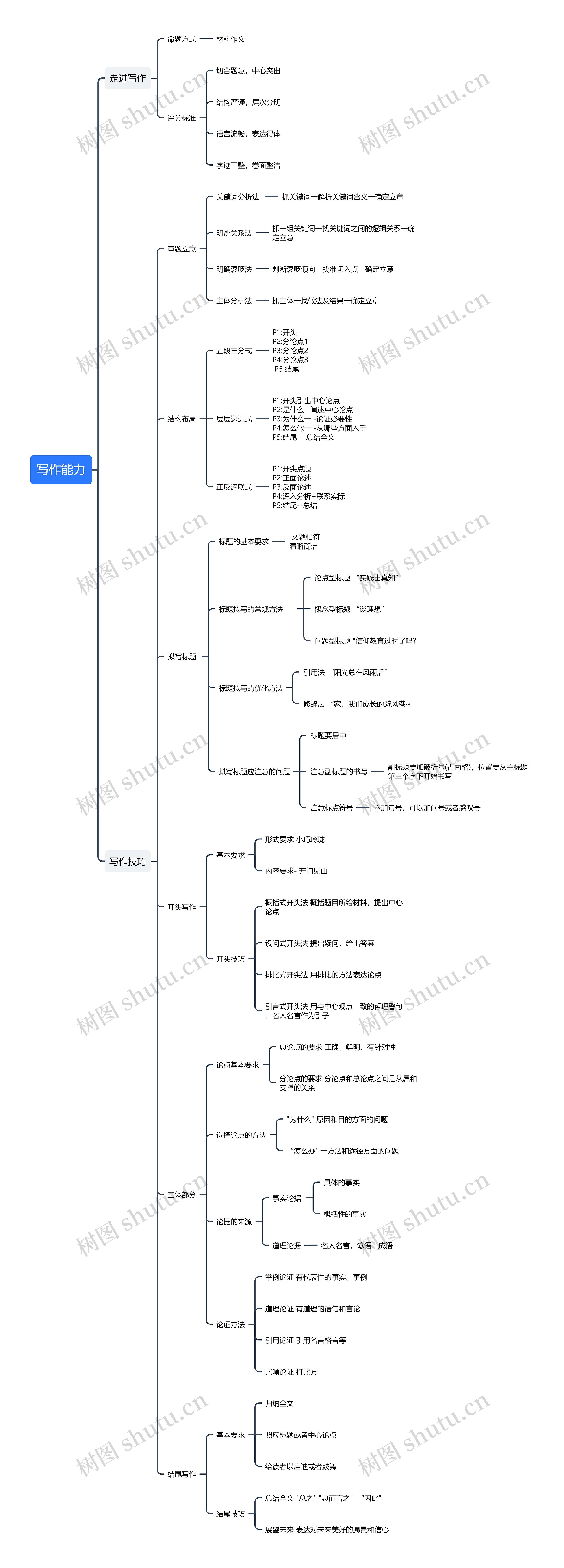 树图思维导图提供《教资科一:写作能力技巧》在线思维导图免费制作,点击“编辑”按钮,可对《教资科一:写作能力技巧》进行在线思维导图编辑,本思维导图属于思维导图模板主题,文件编号是:84c83114a6361b9a99ffdbc415d20714