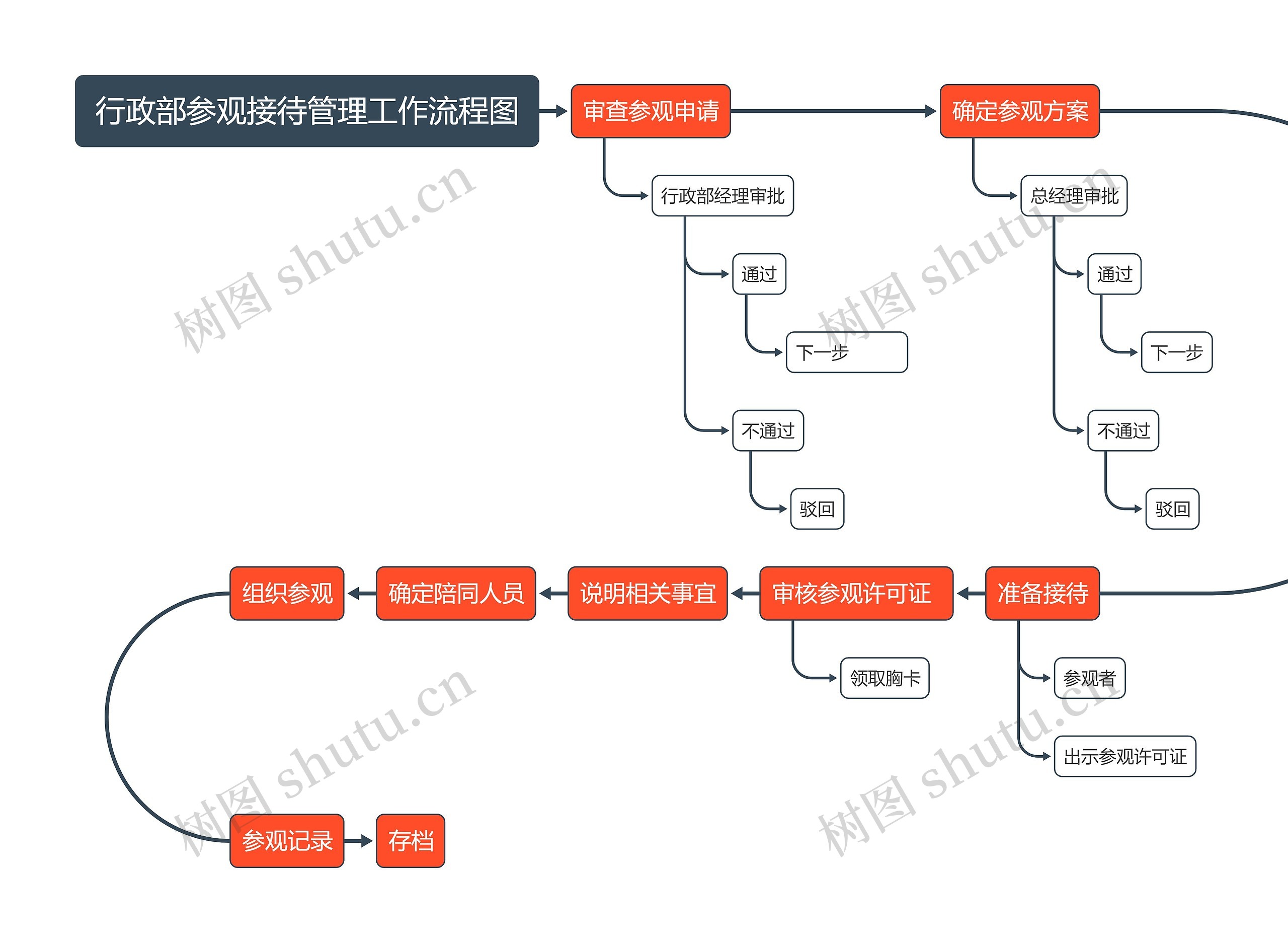 树图思维导图提供《行政部参观接待管理工作流程图》在线思维导图免费制作,点击“编辑”按钮,可对《行政部参观接待管理工作流程图》进行在线思维导图编辑,本思维导图属于思维导图模板主题,文件编号是:447408402a05d531bdb090a5a1adef5e
