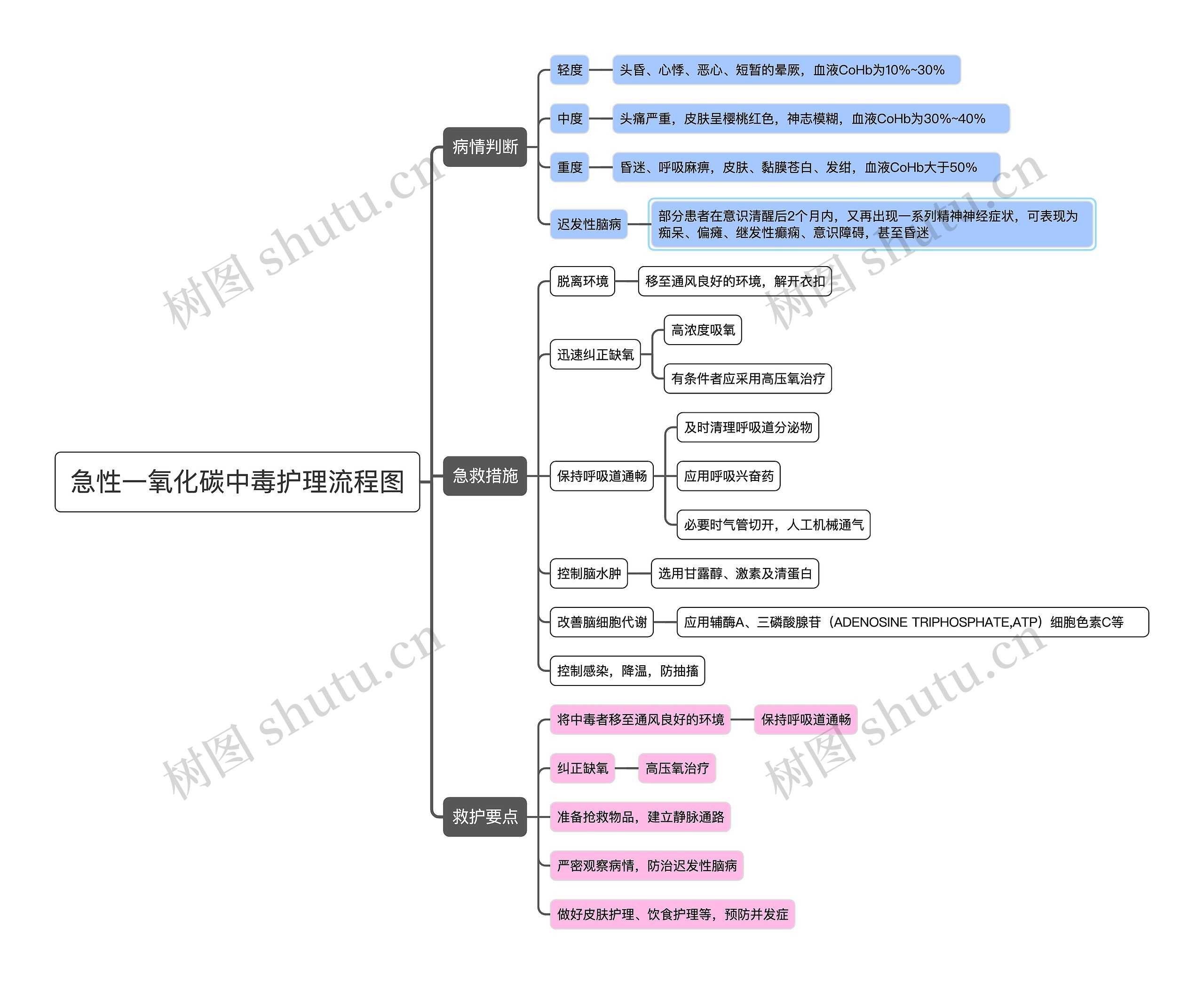 树图思维导图提供《急性一氧化碳中毒护理流程图》在线思维导图免费制作,点击“编辑”按钮,可对《急性一氧化碳中毒护理流程图》进行在线思维导图编辑,本思维导图属于思维导图模板主题,文件编号是:d8f94601c110a30721a0a4fa3939d333