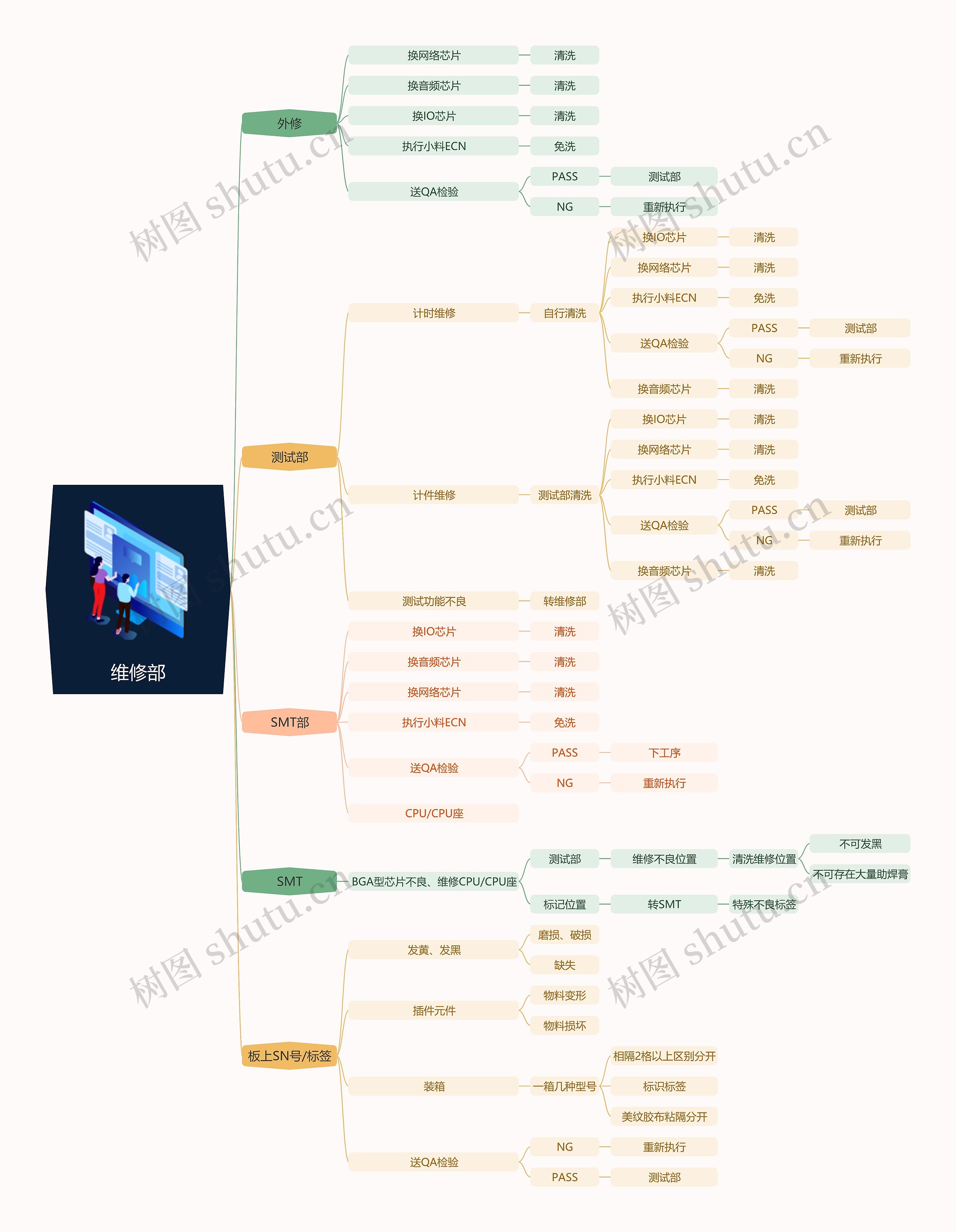 树图思维导图提供《维修部工作流程》在线思维导图免费制作,点击“编辑”按钮,可对《维修部工作流程》进行在线思维导图编辑,本思维导图属于思维导图模板主题,文件编号是:0cab7b269c51ded46b55c3a55b65983f