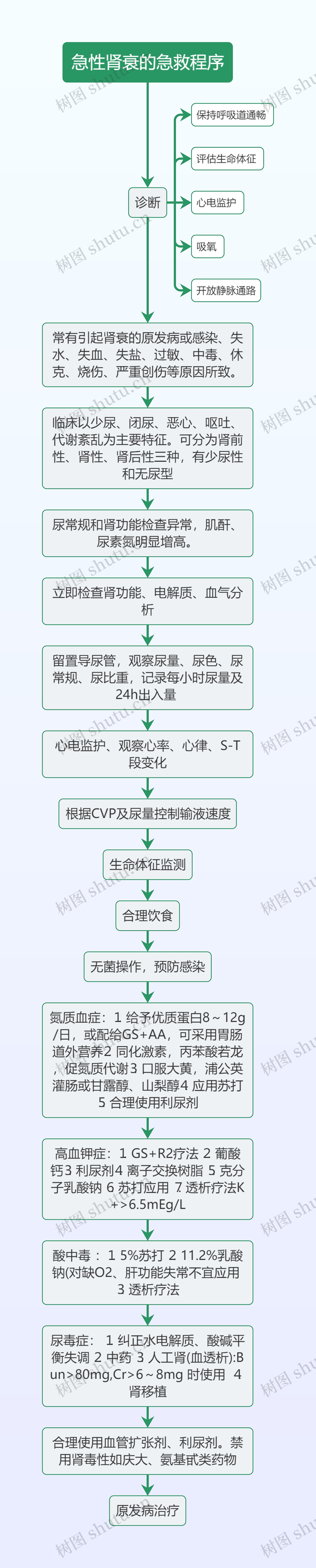 氮质血症:⒈给予优质蛋白8~12g/日,或配给GS+AA,可采用胃肠道外营养⒉同化激素,丙苯酸若龙,促氮质代谢⒊口服大黄,浦公英灌肠或甘露醇、山梨醇⒋应用苏打⒌合理使用利尿剂