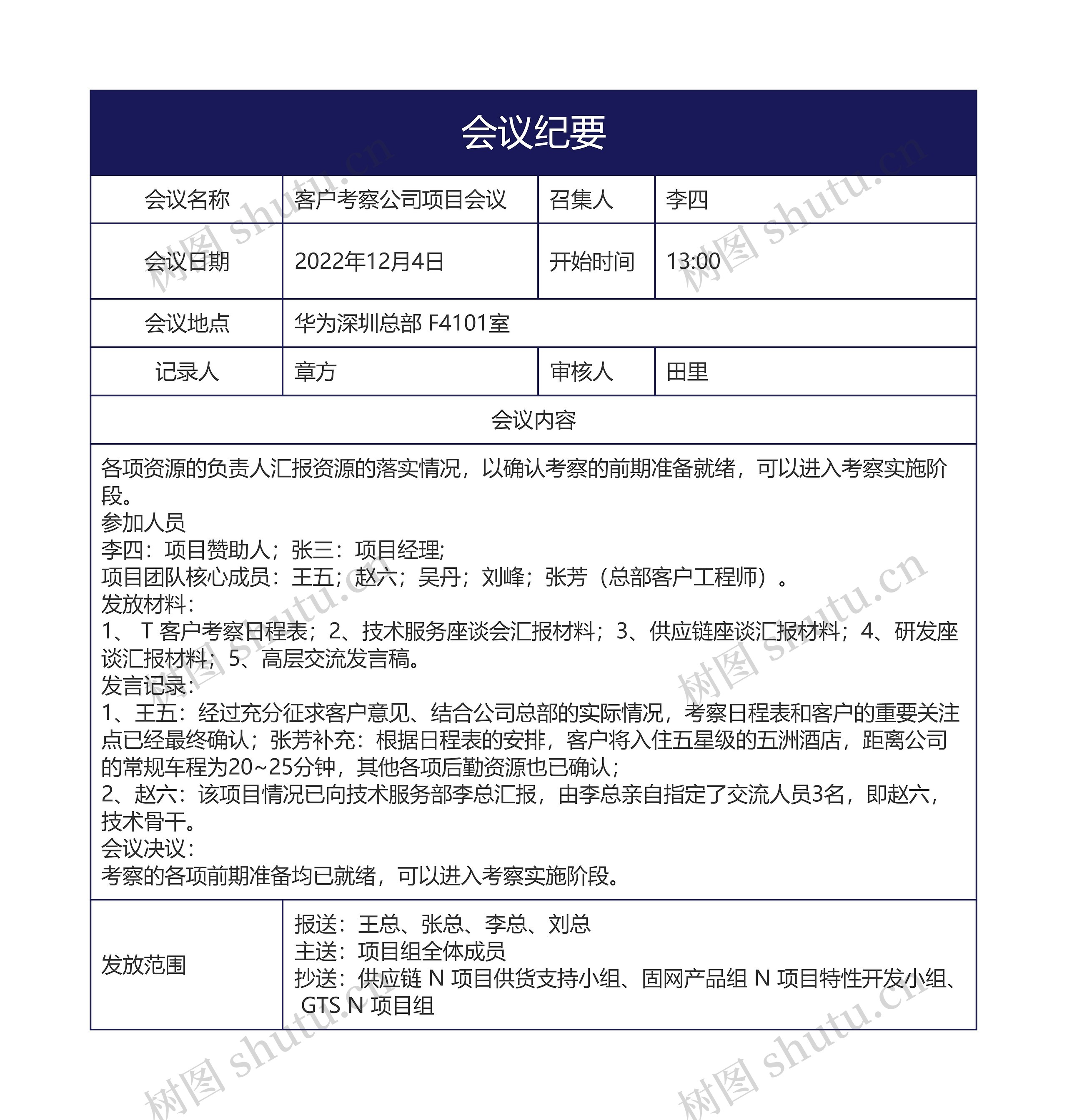 1、王五:经过充分征求客户意见、结合公司总部的实际情况,考察日程表和客户的重要关注点已经最终确认;张芳补充:根据日程表的安排,客户将入住五星级的五洲酒店,距离公司的常规车程为20~25分钟,其他各项后勤资源也已确认;