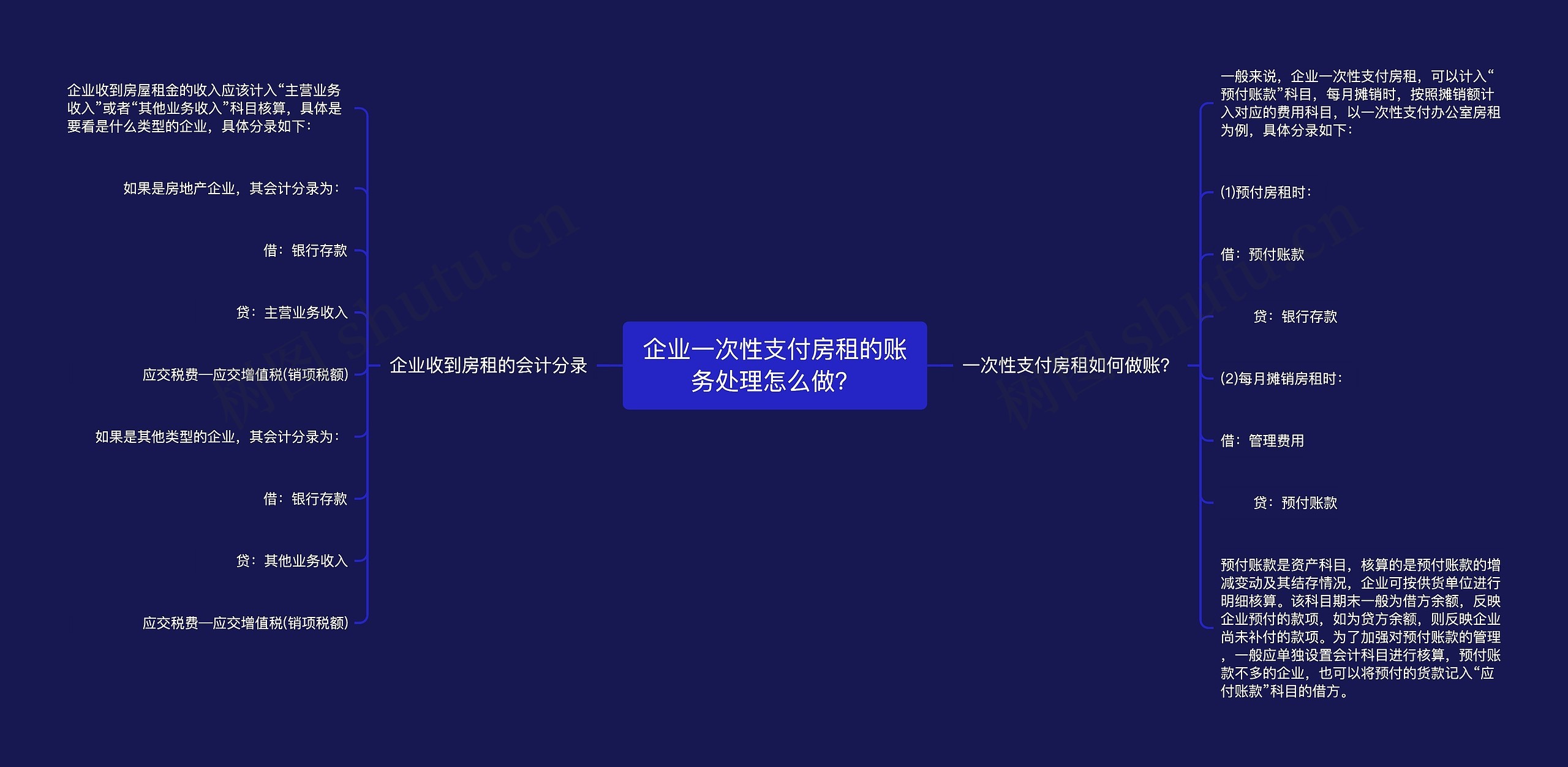 树图思维导图提供《企业一次性支付房租的账务处理怎么做?》在线思维导图免费制作,点击“编辑”按钮,可对《企业一次性支付房租的账务处理怎么做?》进行在线思维导图编辑,本思维导图属于思维导图模板主题,文件编号是:21fca05bc741200dcf7faf8fe6c6dbe1