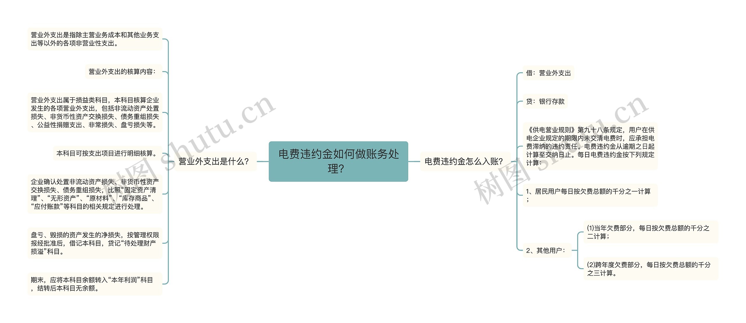 树图思维导图提供《电费违约金如何做账务处理?》在线思维导图免费制作,点击“编辑”按钮,可对《电费违约金如何做账务处理?》进行在线思维导图编辑,本思维导图属于思维导图模板主题,文件编号是:a938bb06882b338f2c5d45d3eb044b0d