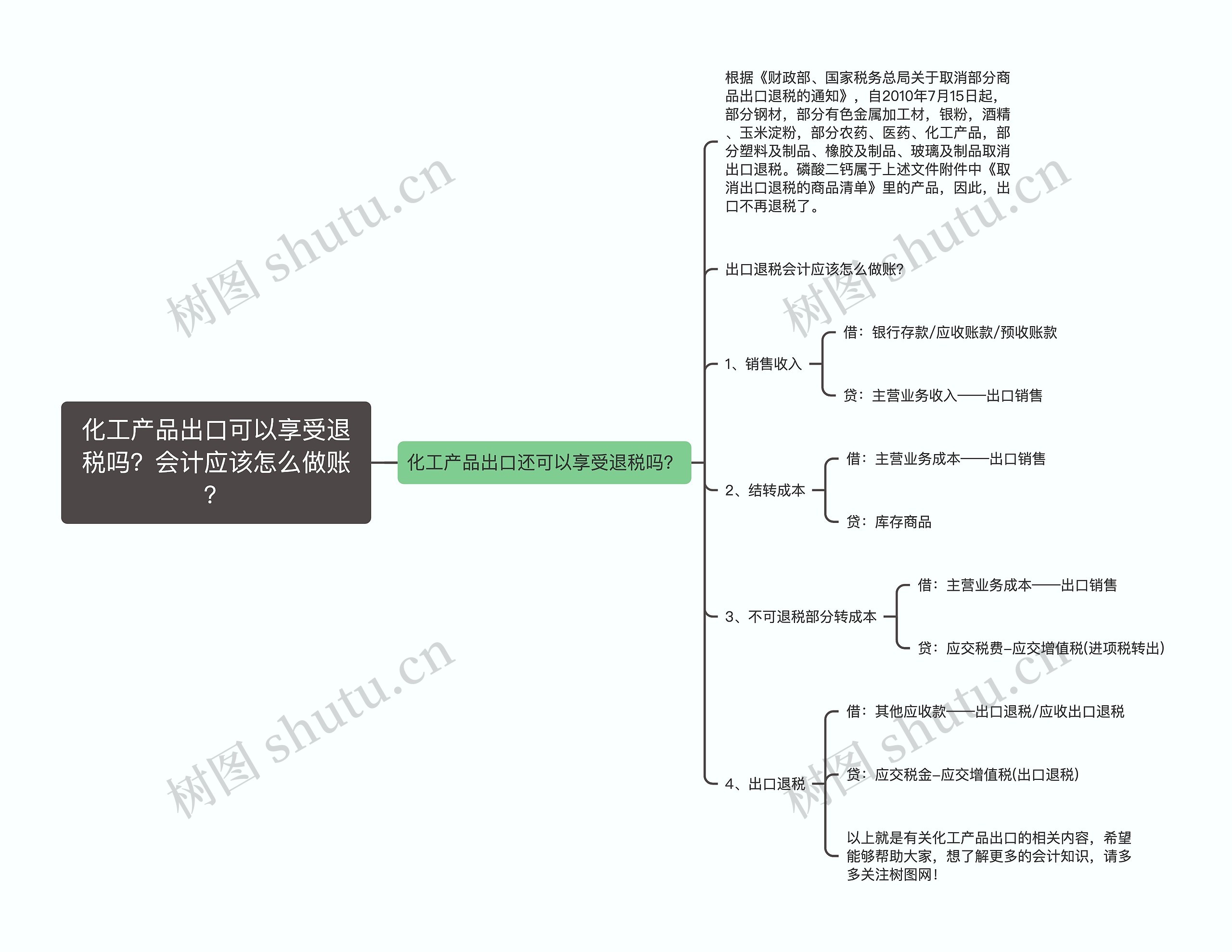 树图思维导图提供《化工产品出口可以享受退税吗?会计应该怎么做账?》在线思维导图免费制作,点击“编辑”按钮,可对《化工产品出口可以享受退税吗?会计应该怎么做账?》进行在线思维导图编辑,本思维导图属于思维导图模板主题,文件编号是:547cc14aab17e75a2a6ae7ee4d32f63f
