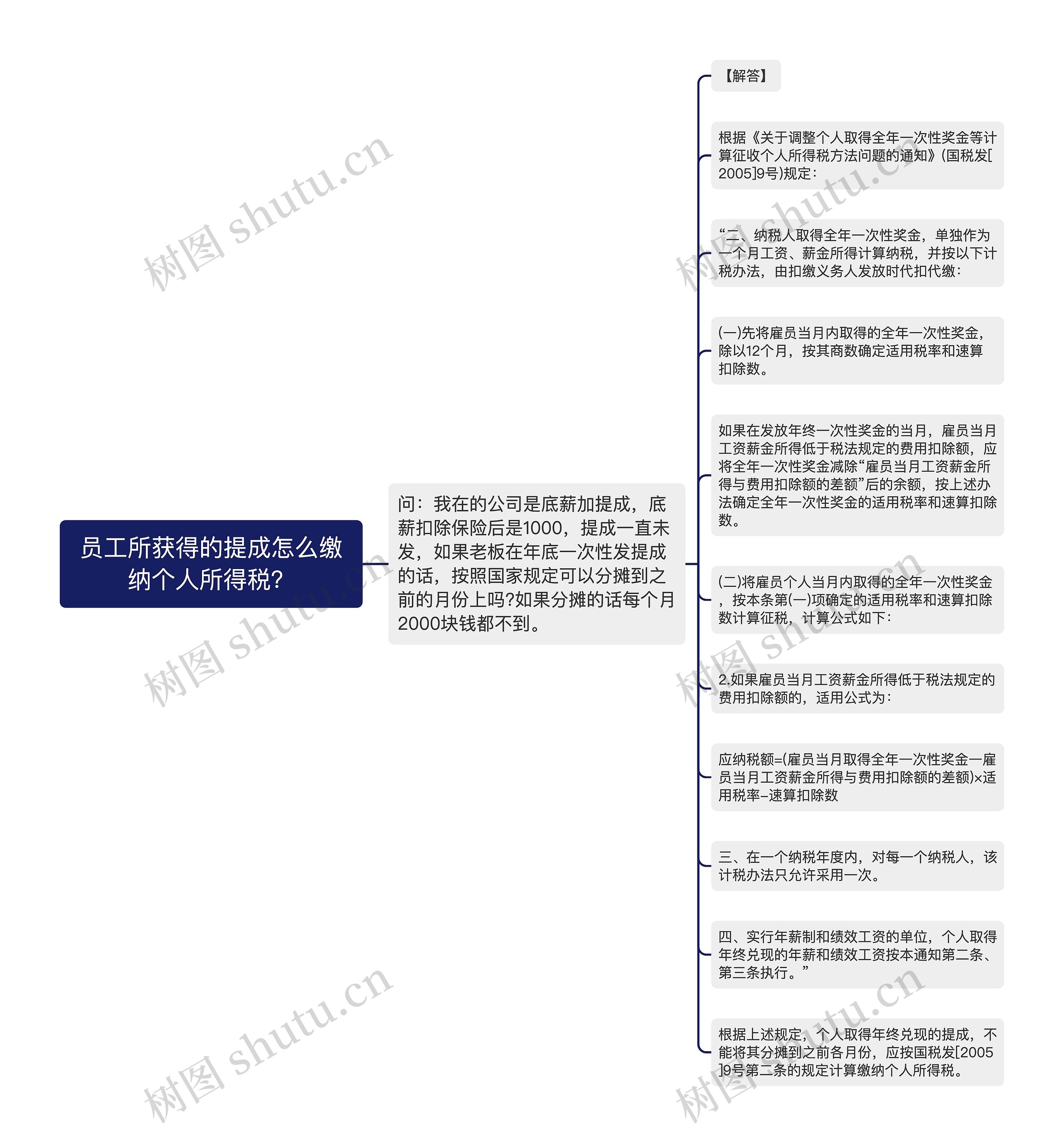 根据上述规定,个人取得年终兑现的提成,不能将其分摊到之前各月份,应按国税发[2005]9号第二条的规定计算缴纳个人所得税。