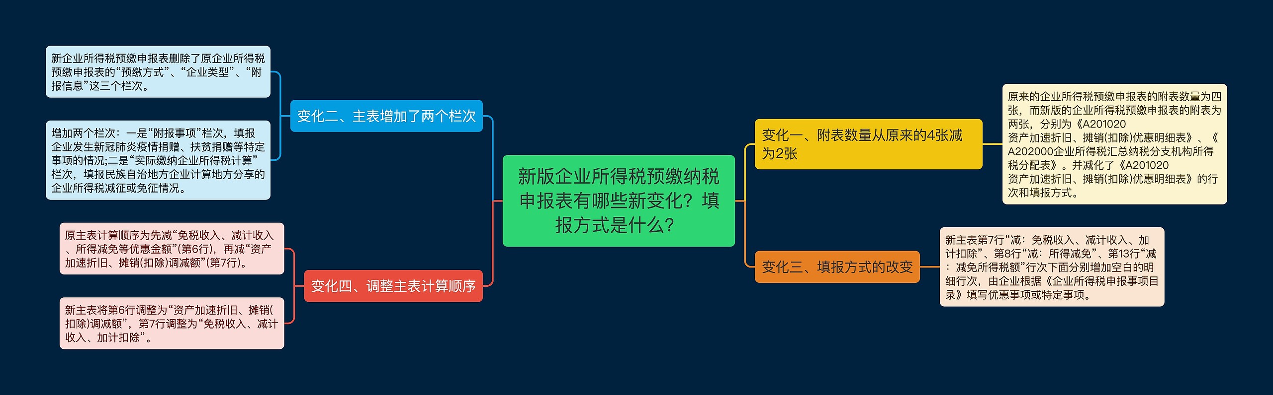 树图思维导图提供《新版企业所得税预缴纳税申报表有哪些新变化?填报方式是什么?》在线思维导图免费制作,点击“编辑”按钮,可对《新版企业所得税预缴纳税申报表有哪些新变化?填报方式是什么?》进行在线思维导图编辑,本思维导图属于思维导图模板主题,文件编号是:c87259c68272c6152ae578c33bbd4d86