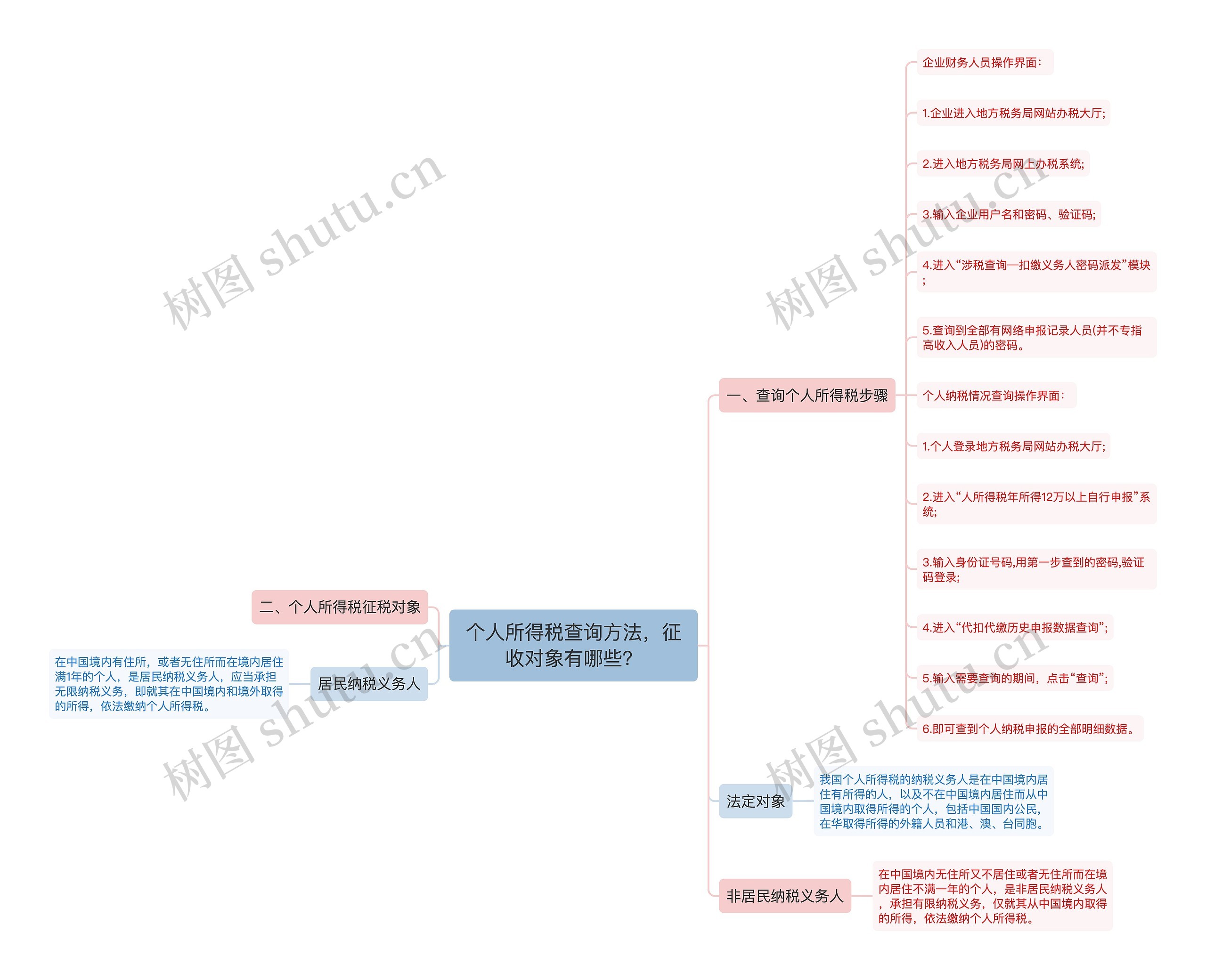 树图思维导图提供《个人所得税查询方法,征收对象有哪些?》在线思维导图免费制作,点击“编辑”按钮,可对《个人所得税查询方法,征收对象有哪些?》进行在线思维导图编辑,本思维导图属于思维导图模板主题,文件编号是:db9cc2819bbbd2ed837c634a6b499e35