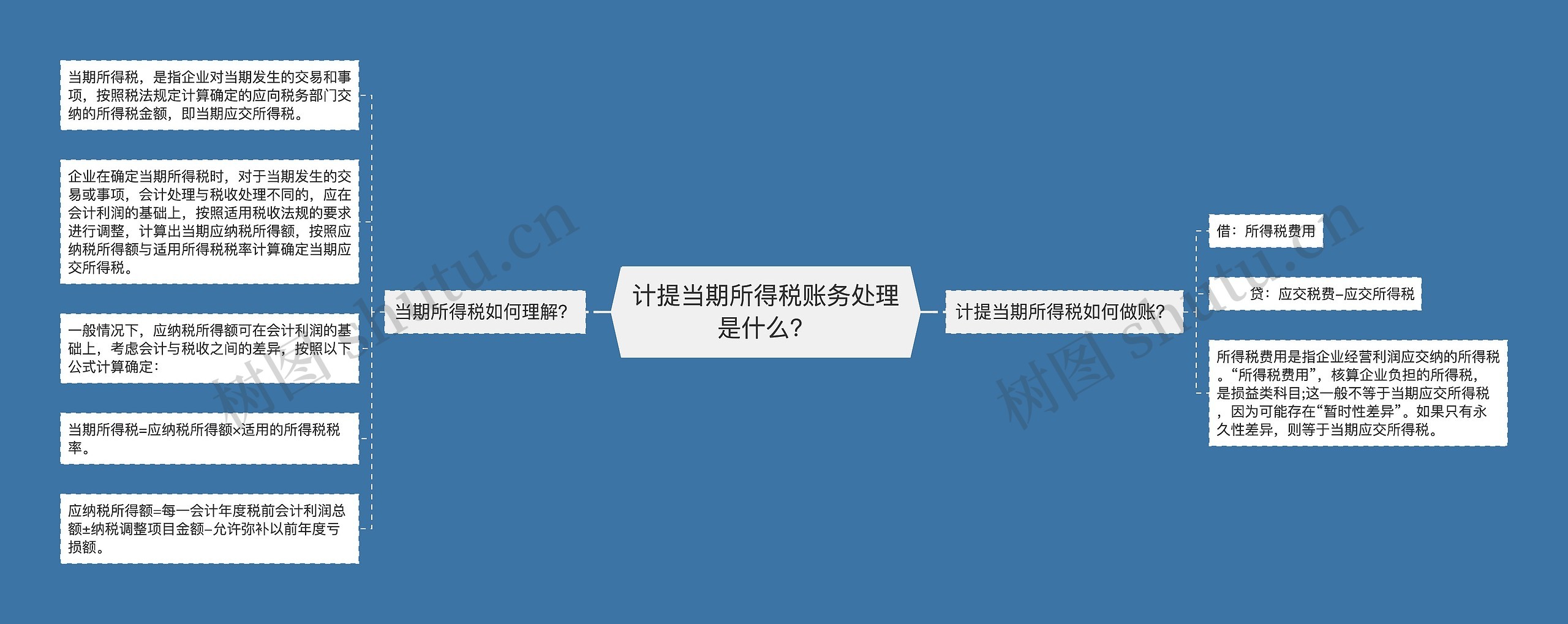 树图思维导图提供《计提当期所得税账务处理是什么?》在线思维导图免费制作,点击“编辑”按钮,可对《计提当期所得税账务处理是什么?》进行在线思维导图编辑,本思维导图属于思维导图模板主题,文件编号是:9b0b9ebcfd4293487f2e523a5e7e028b