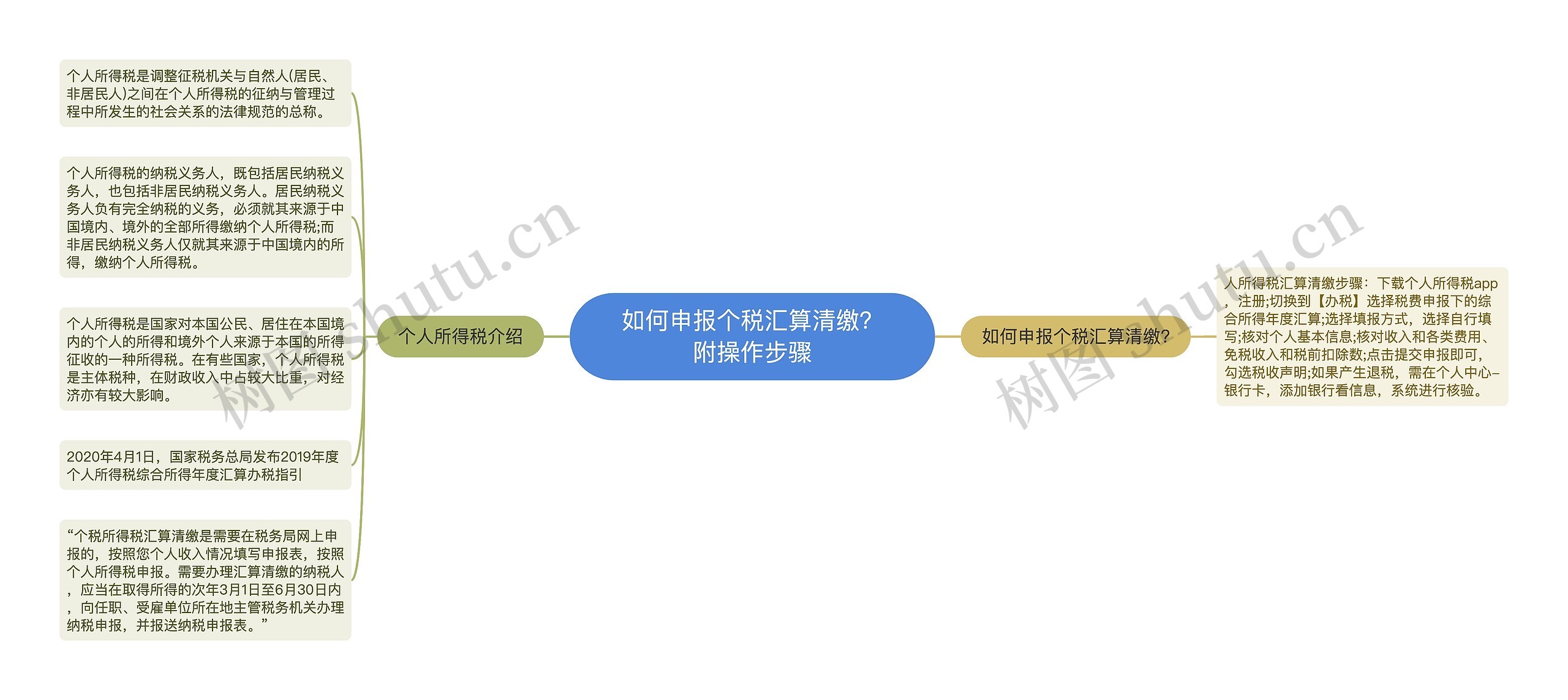 树图思维导图提供《如何申报个税汇算清缴?附操作步骤》在线思维导图免费制作,点击“编辑”按钮,可对《如何申报个税汇算清缴?附操作步骤》进行在线思维导图编辑,本思维导图属于思维导图模板主题,文件编号是:58c940397f8efc011ea8129016628975