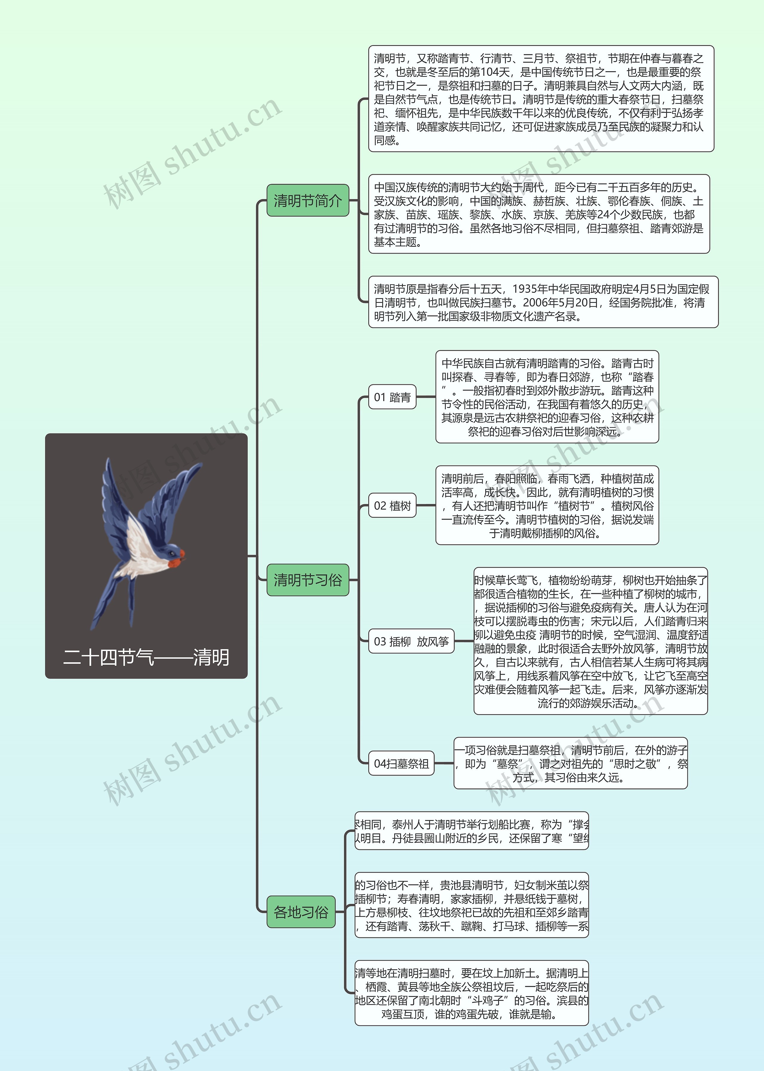 清明节,又称踏青节、行清节、三月节、祭祖节,节期在仲春与暮春之交,也就是冬至后的第104天,是中国传统节日之一,也是最重要的祭祀节日之一,是祭祖和扫墓的日子。清明兼具自然与人文两大内涵,既是自然节气点,也是传统节日。清明节是传统的重大春祭节日,扫墓祭祀、缅怀祖先,是中华民族数千年以来的优良传统,不仅有利于弘扬孝道亲情、唤醒家族共同记忆,还可促进家族成员乃至民族的凝聚力和认同感。