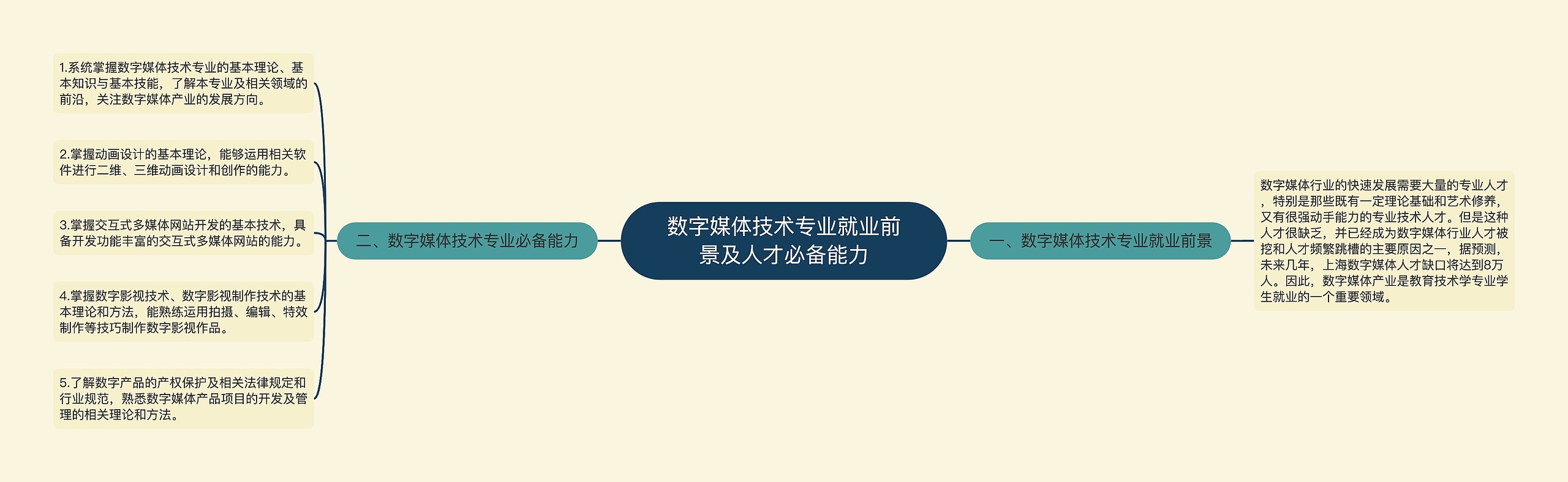 树图思维导图提供《数字媒体技术专业就业前景及人才必备能力》在线思维导图免费制作,点击“编辑”按钮,可对《数字媒体技术专业就业前景及人才必备能力》进行在线思维导图编辑,本思维导图属于思维导图模板主题,文件编号是:19d1e72fcde06f1247e416874b89d84a