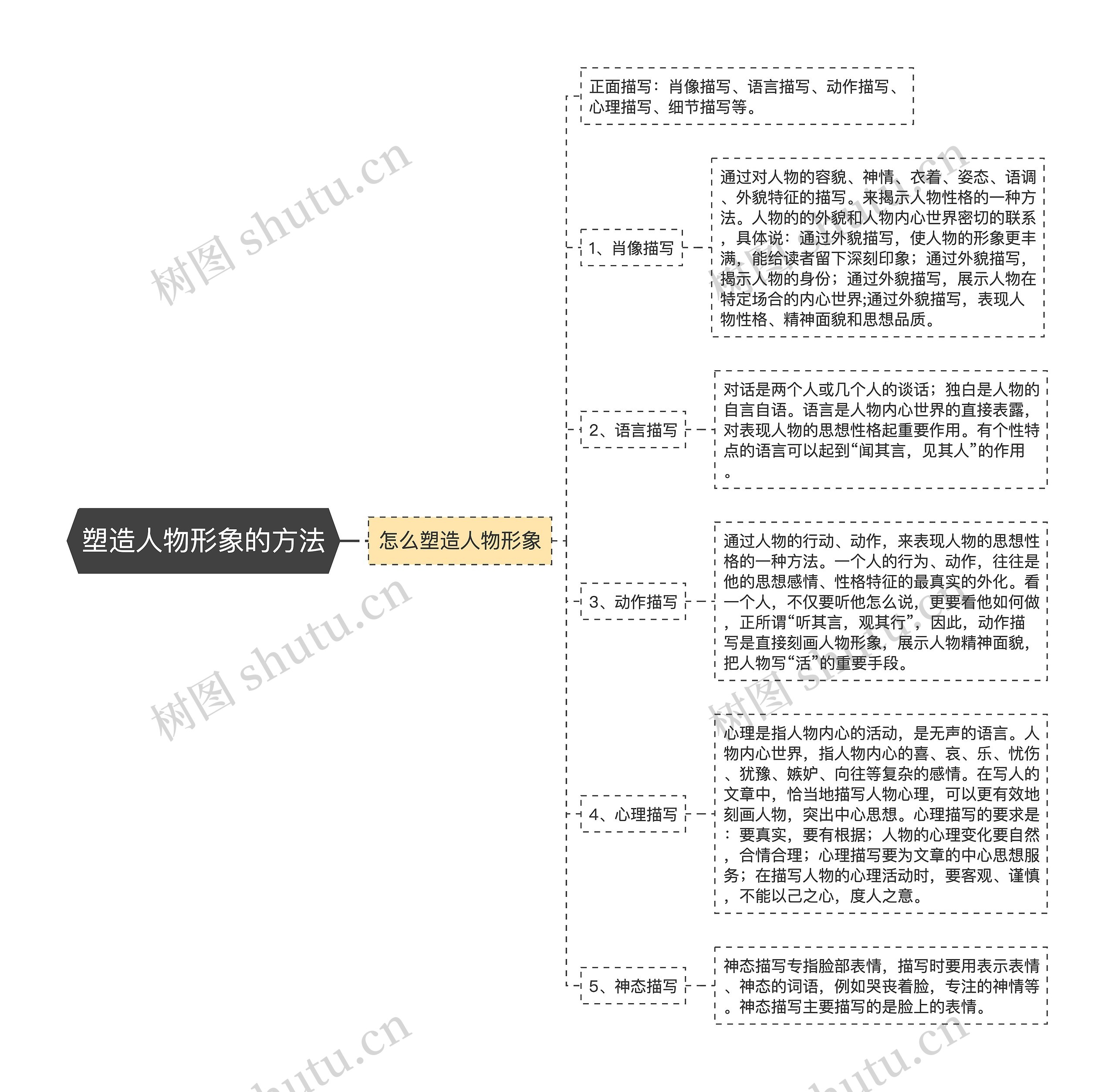 树图思维导图提供《塑造人物形象的方法》在线思维导图免费制作,点击“编辑”按钮,可对《塑造人物形象的方法》进行在线思维导图编辑,本思维导图属于思维导图模板主题,文件编号是:6cf22789949f0b8bbdb90ef258245fa1