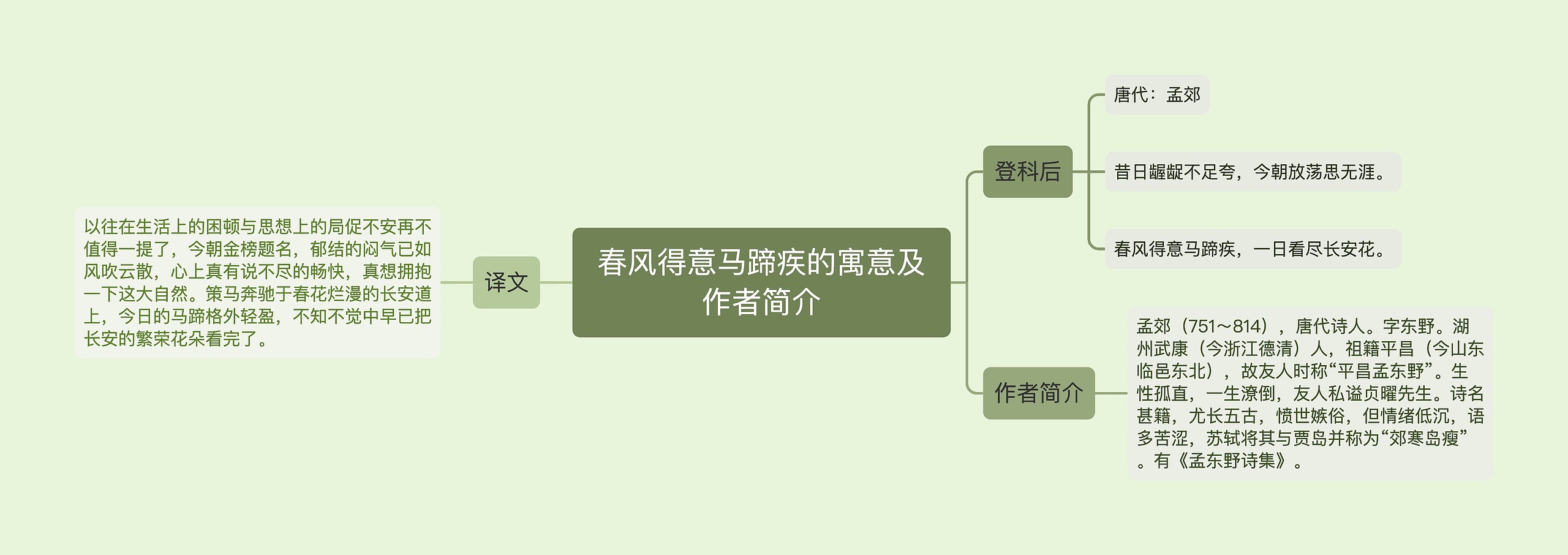 树图思维导图提供《春风得意马蹄疾的寓意及作者简介》在线思维导图免费制作,点击“编辑”按钮,可对《春风得意马蹄疾的寓意及作者简介》进行在线思维导图编辑,本思维导图属于思维导图模板主题,文件编号是:40e3af5c0e94c4131651cc8c46224604