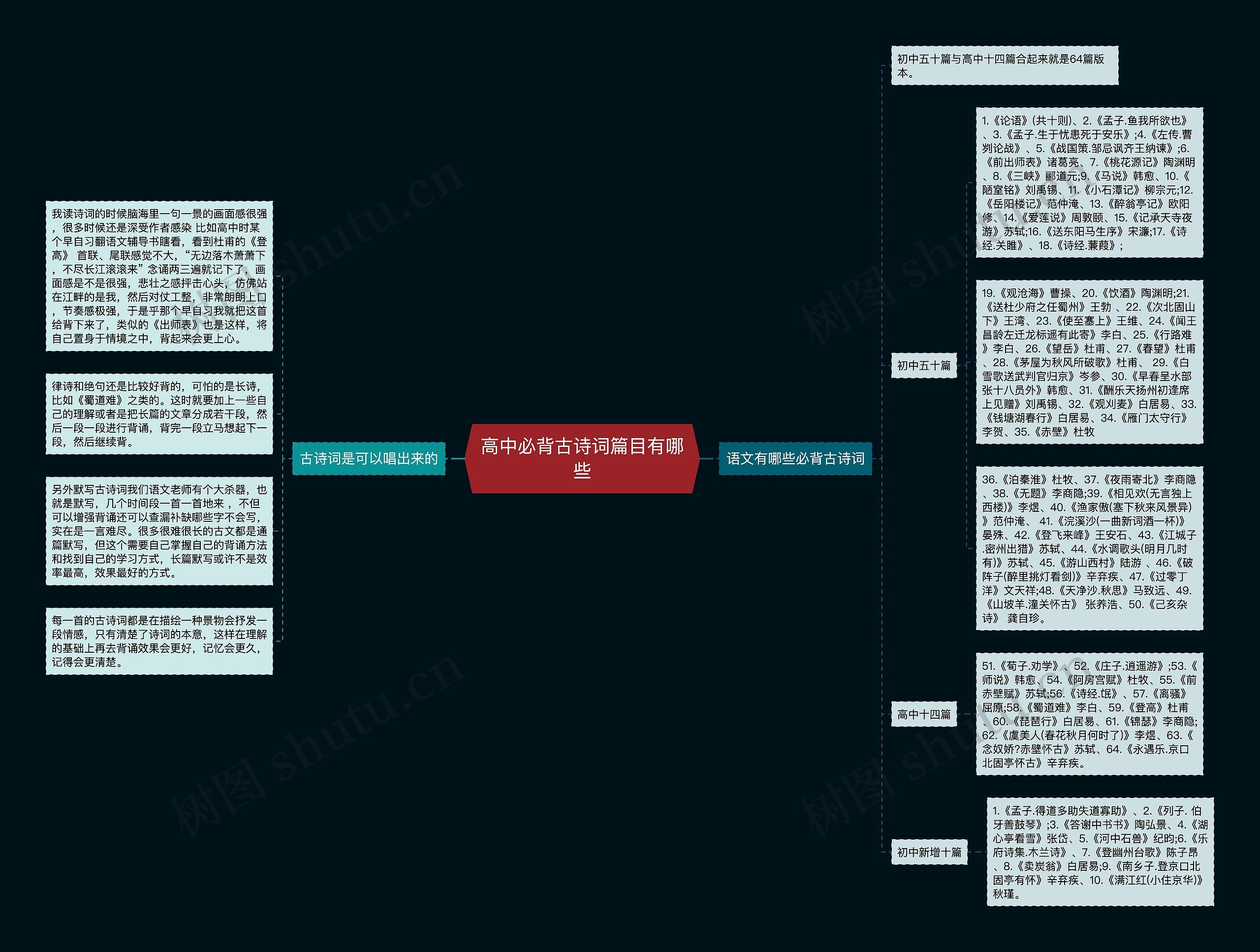 36.《泊秦淮》杜牧、37.《夜雨寄北》李商隐、38.《无题》李商隐;39.《相见欢(无言独上西楼)》李煜、40.《渔家傲(塞下秋来风景异)》范仲淹、 41.《浣溪沙(一曲新词酒一杯)》晏殊、42.《登飞来峰》王安石、43.《江城子.密州出猎》苏轼、44.《水调歌头(明月几时有)》苏轼、45.《游山西村》陆游 、46.《破阵子(醉里挑灯看剑)》辛弃疾、47.《过零丁洋》文天祥;48.《天净沙.秋思》马致远、49.《山坡羊.潼关怀古》 张养浩、50.《己亥杂诗》 龚自珍。