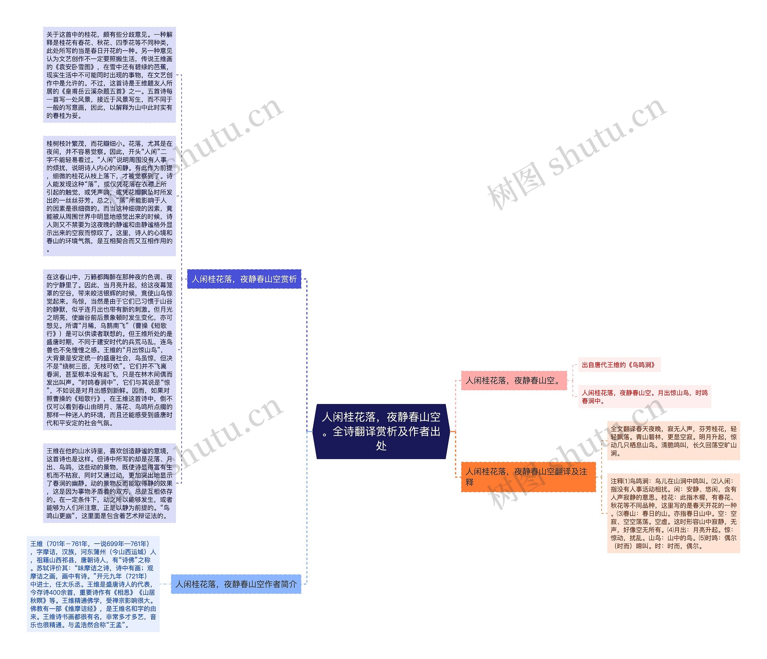 桂树枝叶繁茂,而花瓣细小。花落,尤其是在夜间,并不容易觉察。因此,开头“人闲”二字不能轻易看过。“人闲”说明周围没有人事的烦扰,说明诗人内心的闲静。有此作为前提,细微的桂花从枝上落下,才被觉察到了。诗人能发现这种“落”,或仅凭花落在衣襟上所引起的触觉,或凭声响,或凭花瓣飘坠时所发出的一丝丝芬芳。总之,“落”所能影响于人的因素是很细微的。而当这种细微的因素,竟能被从周围世界中明显地感觉出来的时候,诗人则又不禁要为这夜晚的静谧和由静谧格外显示出来的空寂而惊叹了。这里,诗人的心境和春山的环境气氛,是互相契合而又互相作用的。