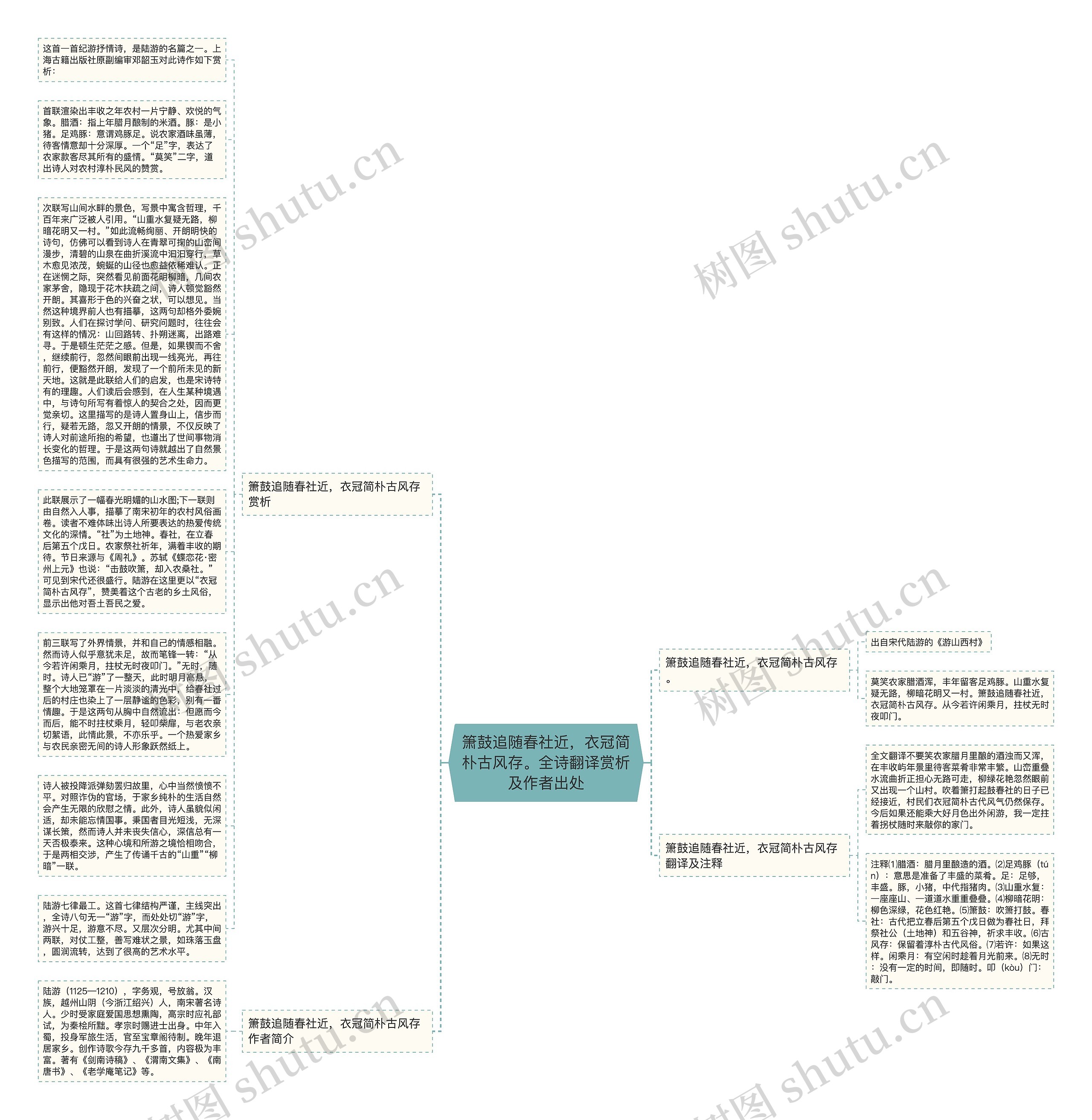 此联展示了一幅春光明媚的山水图;下一联则由自然入人事,描摹了南宋初年的农村风俗画卷。读者不难体味出诗人所要表达的热爱传统文化的深情。“社”为土地神。春社,在立春后第五个戊日。农家祭社祈年,满着丰收的期待。节日来源与《周礼》。苏轼《蝶恋花·密州上元》也说:“击鼓吹箫,却入农桑社。”可见到宋代还很盛行。陆游在这里更以“衣冠简朴古风存”,赞美着这个古老的乡土风俗,显示出他对吾土吾民之爱。