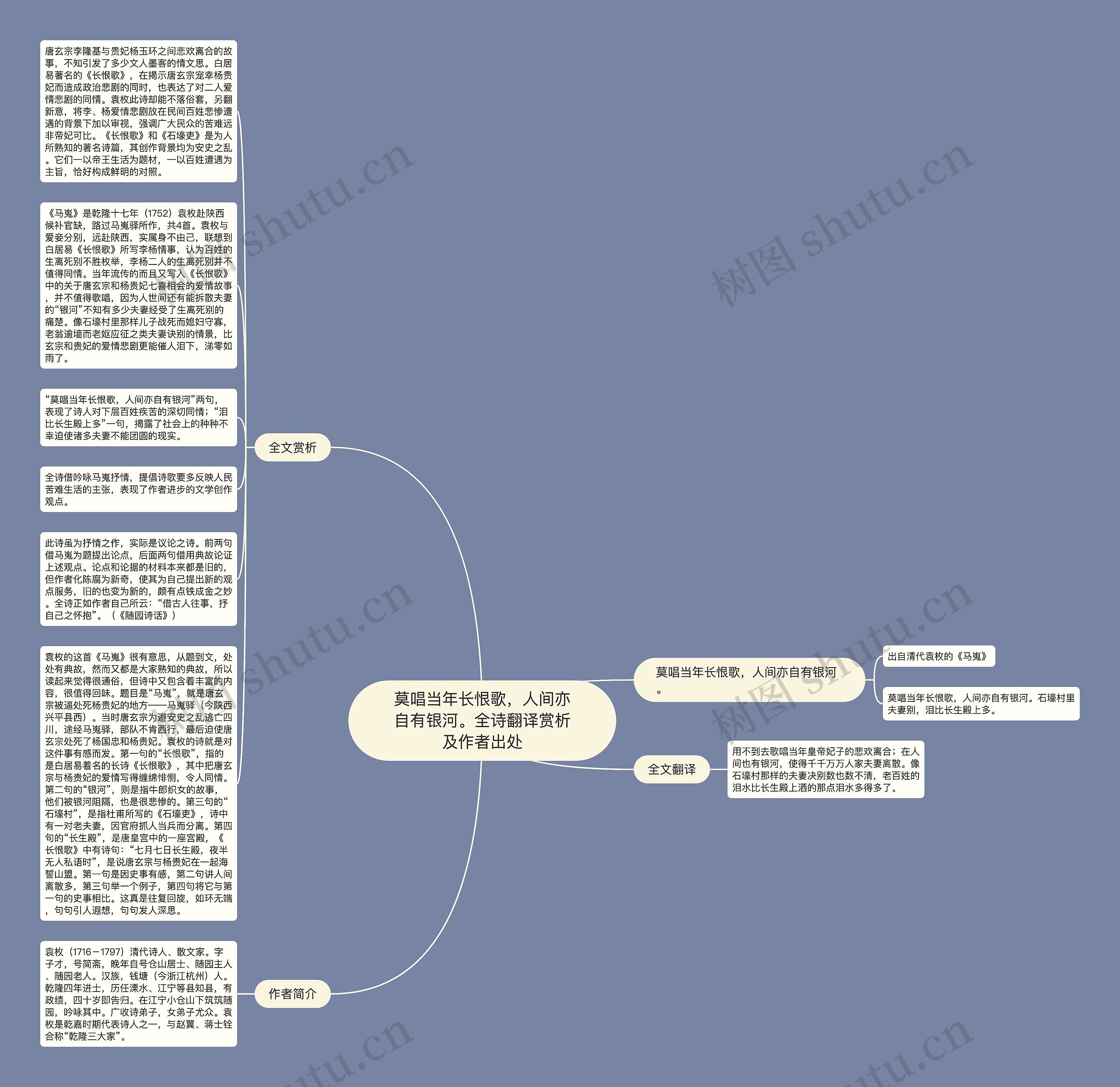 袁枚的这首《马嵬》很有意思,从题到文,处处有典故,然而又都是大家熟知的典故,所以读起来觉得很通俗,但诗中又包含着丰富的内容,很值得回味。题目是“马嵬”,就是唐玄宗被逼处死杨贵妃的地方——马嵬驿(今陕西兴平县西)。当时唐玄宗为避安史之乱逃亡四川,途经马嵬驿,部队不肯西行,最后迫使唐玄宗处死了杨国忠和杨贵妃。袁枚的诗就是对这件事有感而发。第一句的“长恨歌”,指的是白居易着名的长诗《长恨歌》,其中把唐玄宗与杨贵妃的爱情写得缠绵悱恻,令人同情。第二句的“银河”,则是指牛郎织女的故事,他们被银河阻隔,也是很悲惨的。第三句的“石壕村”,是指杜甫所写的《石壕吏》,诗中有一对老夫妻,因官府抓人当兵而分离。第四句的“长生殿”,是唐皇宫中的一座宫殿,《长恨歌》中有诗句:“七月七日长生殿,夜半无人私语时”,是说唐玄宗与杨贵妃在一起海誓山盟。第一句是因史事有感,第二句讲人间离散多,第三句举一个例子,第四句将它与第一句的史事相比。这真是往复回旋,如环无端,句句引人遐想,句句发人深思。