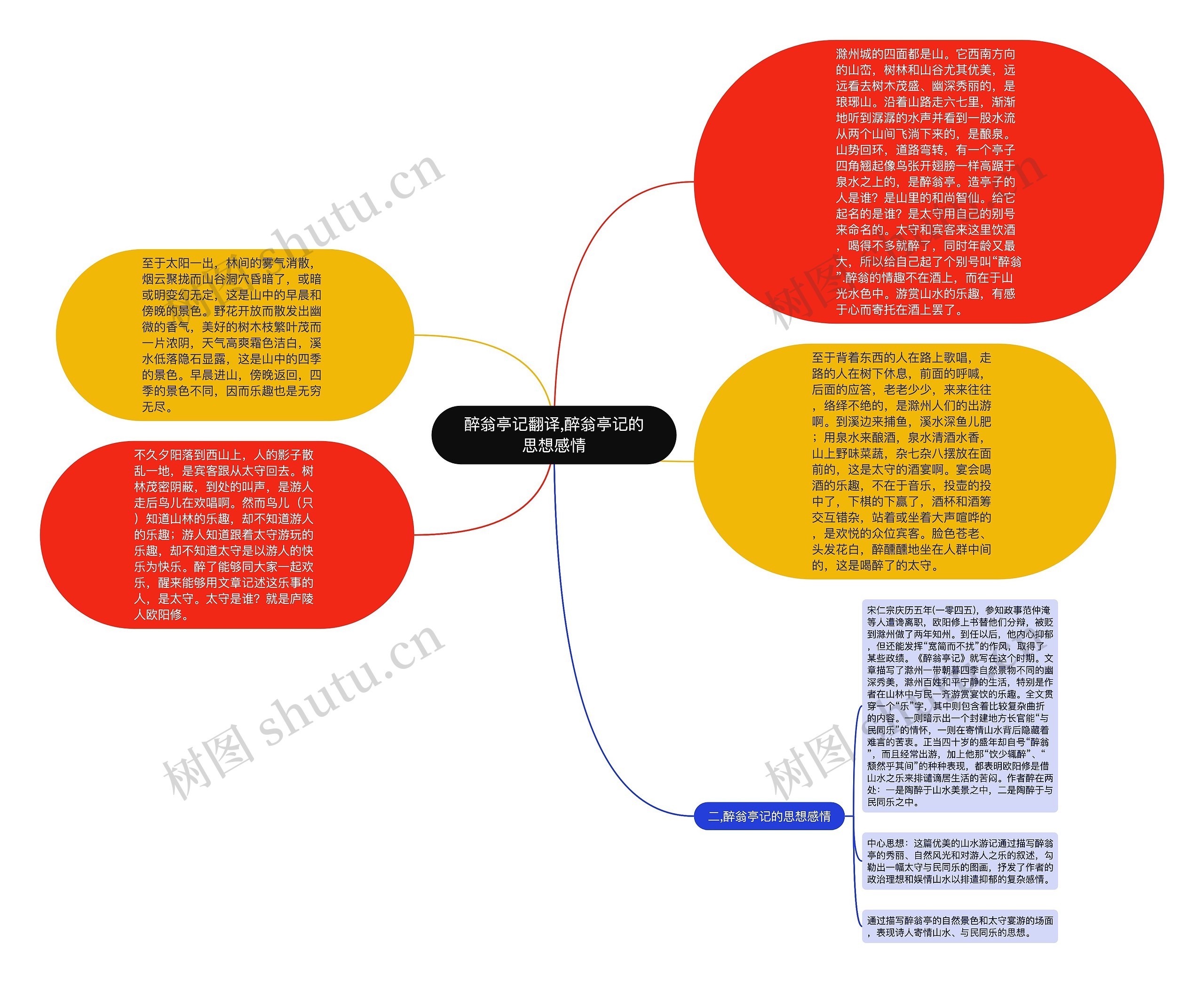 中心思想:这篇优美的山水游记通过描写醉翁亭的秀丽、自然风光和对游人之乐的叙述,勾勒出一幅太守与民同乐的图画,抒发了作者的政治理想和娱情山水以排遣抑郁的复杂感情。