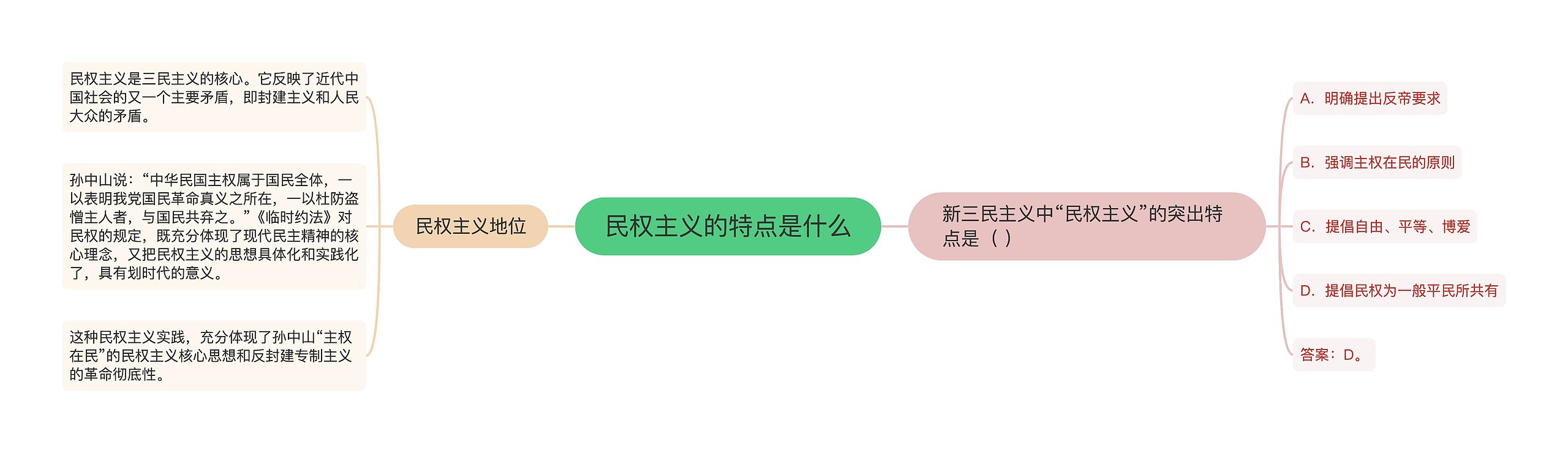 树图思维导图提供《民权主义的特点是什么》在线思维导图免费制作,点击“编辑”按钮,可对《民权主义的特点是什么》进行在线思维导图编辑,本思维导图属于思维导图模板主题,文件编号是:97031af5411588f064b0db2d75064fe2