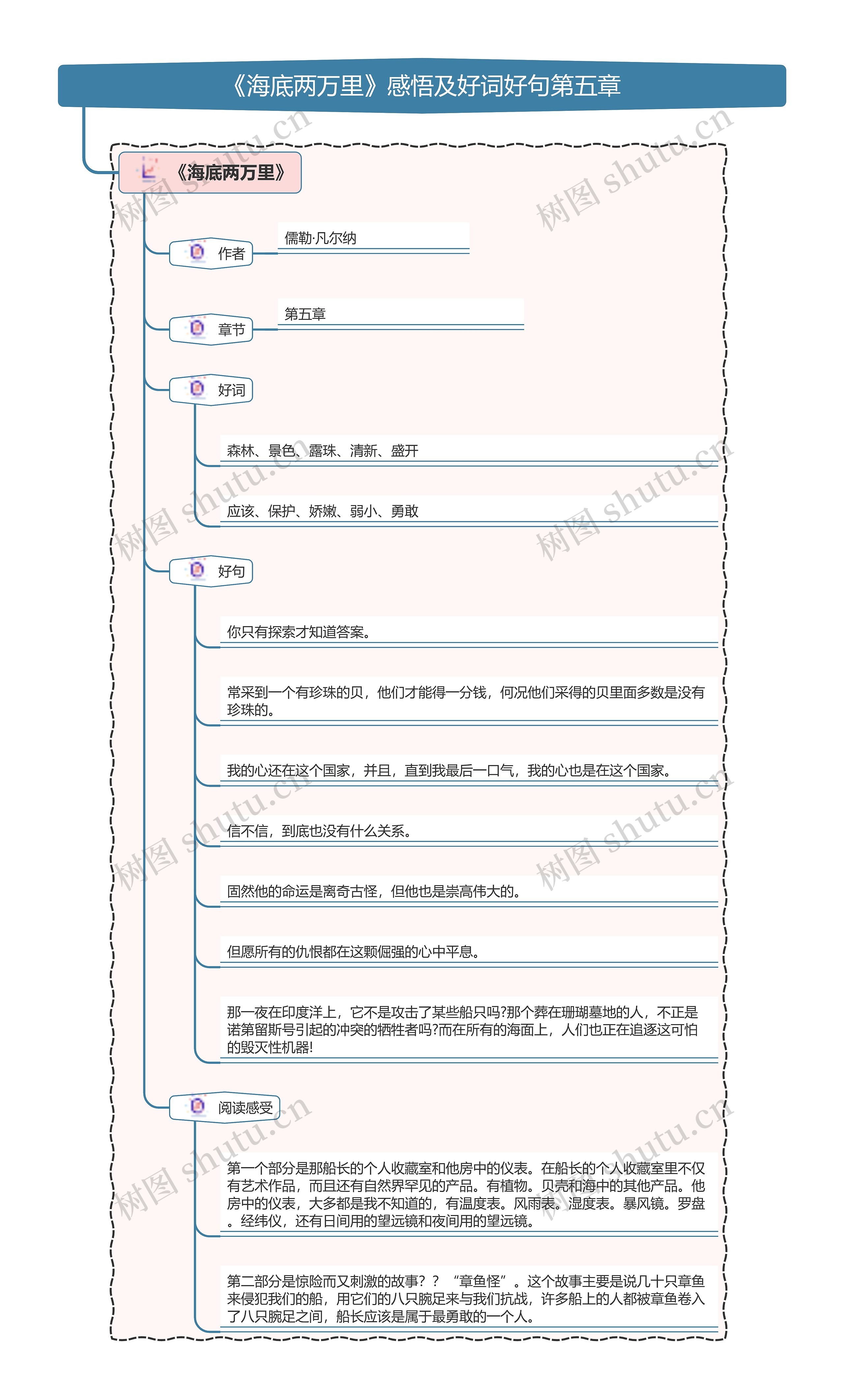 树图思维导图提供《《海底两万里》感悟及好词好句第五章思维导图》在线思维导图免费制作,点击“编辑”按钮,可对《《海底两万里》感悟及好词好句第五章思维导图》进行在线思维导图编辑,本思维导图属于思维导图模板主题,文件编号是:89aa7d24d9cb1c12d7d11e5ae4b67e76