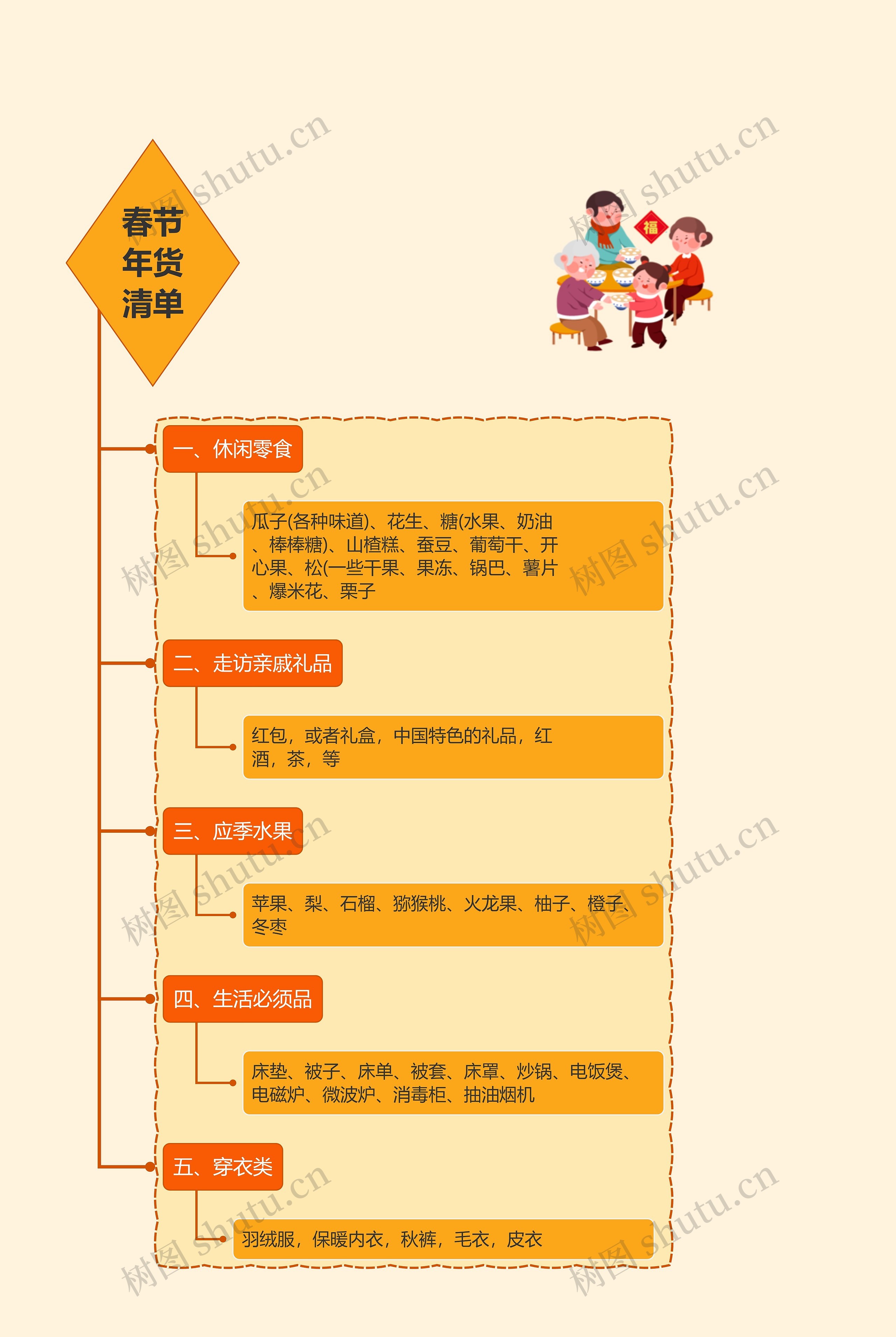 树图思维导图提供《春节年货清单YH》在线思维导图免费制作,点击“编辑”按钮,可对《春节年货清单YH》进行在线思维导图编辑,本思维导图属于思维导图模板主题,文件编号是:677bab00088602106f22ef28b5fab5dd