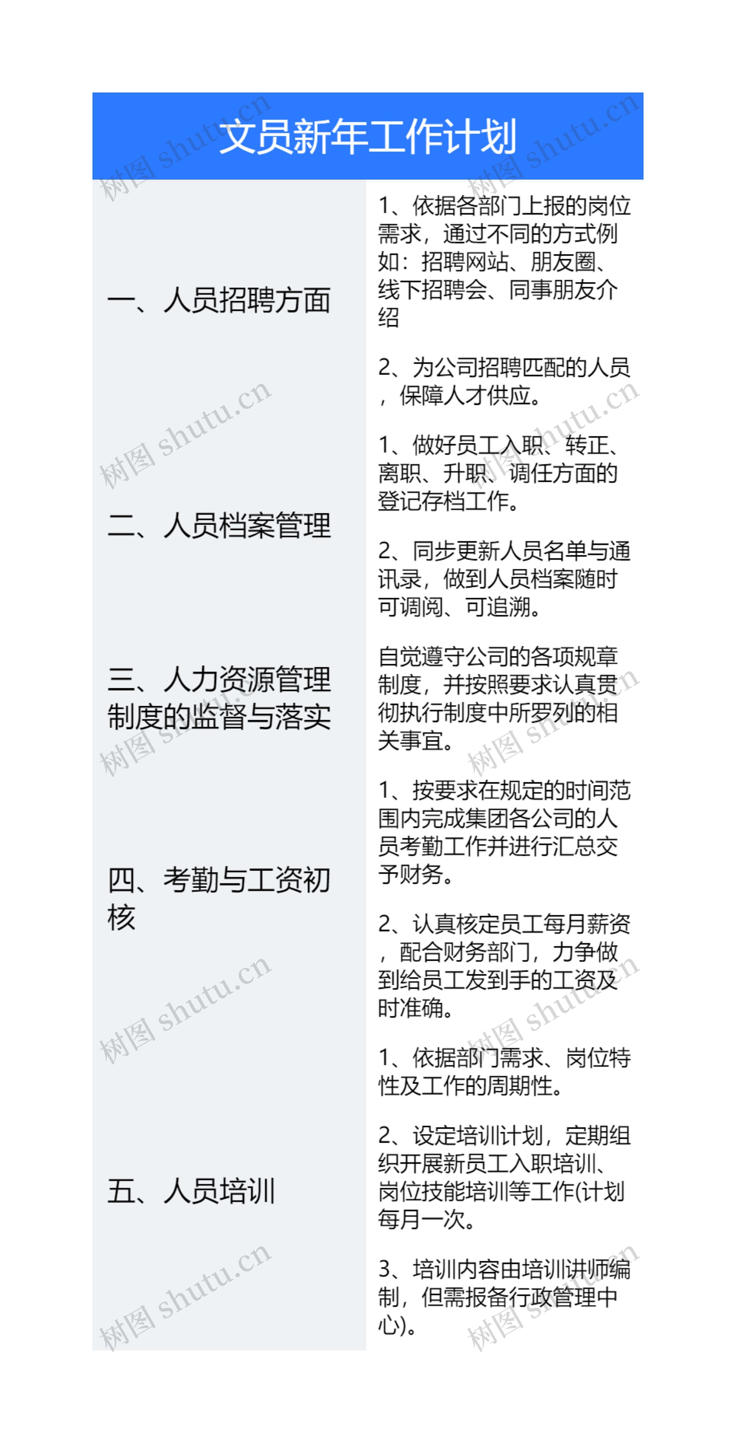 树图思维导图提供《文员新年工作计划》在线思维导图免费制作,点击“编辑”按钮,可对《文员新年工作计划》进行在线思维导图编辑,本思维导图属于思维导图模板主题,文件编号是:d4cc66e4678fb76793a7212405829889