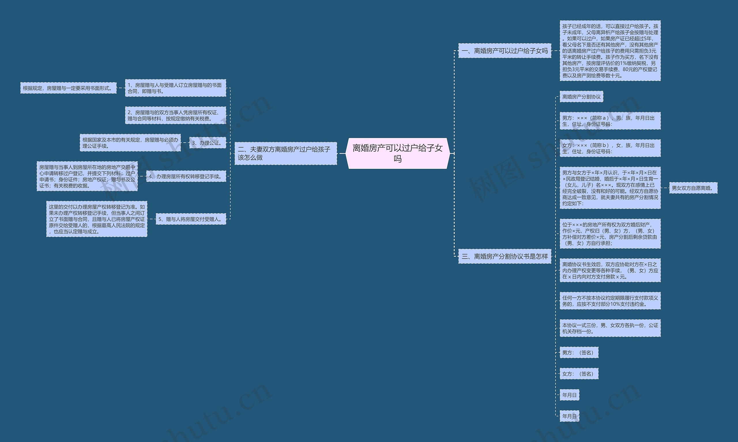 树图思维导图提供《离婚房产可以过户给子女吗》在线思维导图免费制作,点击“编辑”按钮,可对《离婚房产可以过户给子女吗》进行在线思维导图编辑,本思维导图属于思维导图模板主题,文件编号是:5a057cd53c24bd1c377a74f12f3dda29