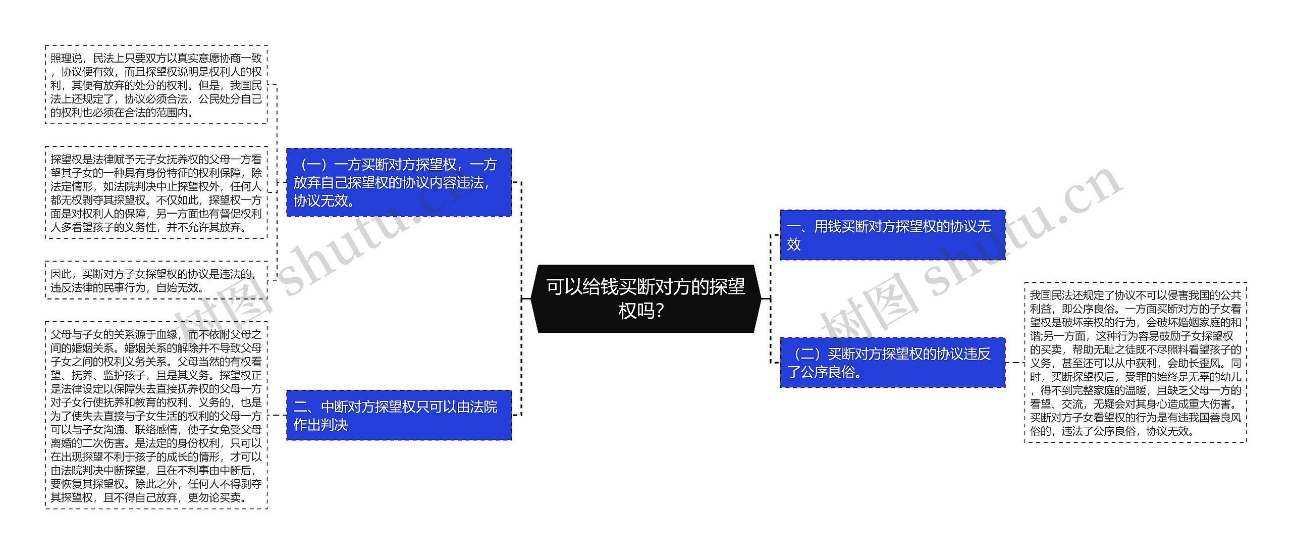 父母与子女的关系源于血缘,而不依附父母之间的婚姻关系。婚姻关系的解除并不导致父母子女之间的权利义务关系。父母当然的有权看望、抚养、监护孩子,且是其义务。探望权正是法律设定以保障失去直接抚养权的父母一方对子女行使抚养和教育的权利、义务的,也是为了使失去直接与子女生活的权利的父母一方可以与子女沟通、联络感情,使子女免受父母离婚的二次伤害。是法定的身份权利,只可以在出现探望不利于孩子的成长的情形,才可以由法院判决中断探望,且在不利事由中断后,要恢复其探望权。除此之外,任何人不得剥夺其探望权,且不得自己放弃,更勿论买卖。